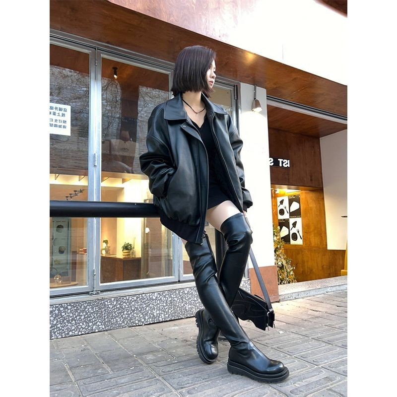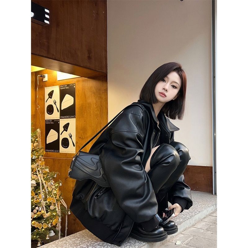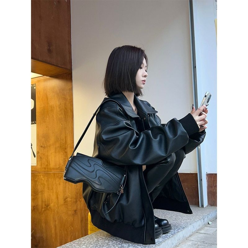 ฤดูใบไม้ผลิฤดูใบไม้ร่วงนักเรียน ปู่ หนังแจ็คเก็ตสีดําผู้หญิงย้อนยุคอเมริกันระดับไฮเอนด์รถจักรยานยนต์ด้านบนอินเทรนด์