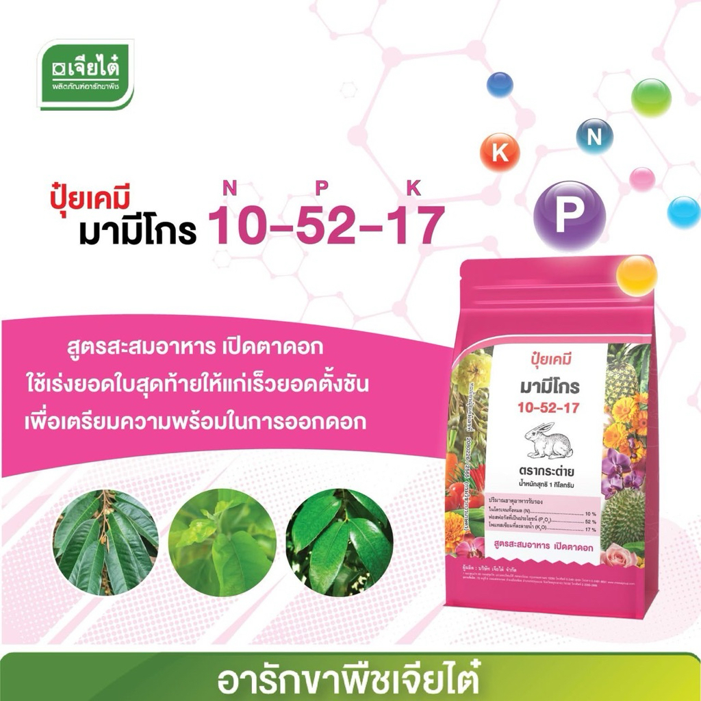 ปุ๋ยเกร็ดมามีโกร10-52-17 ตรากระต่ายขนาด1 กก ละลายน้ำได้ดีเยี่ยม ดูดซึมได้ทั้งทางรากและทางใบเร่งการออกดอกและติดผล