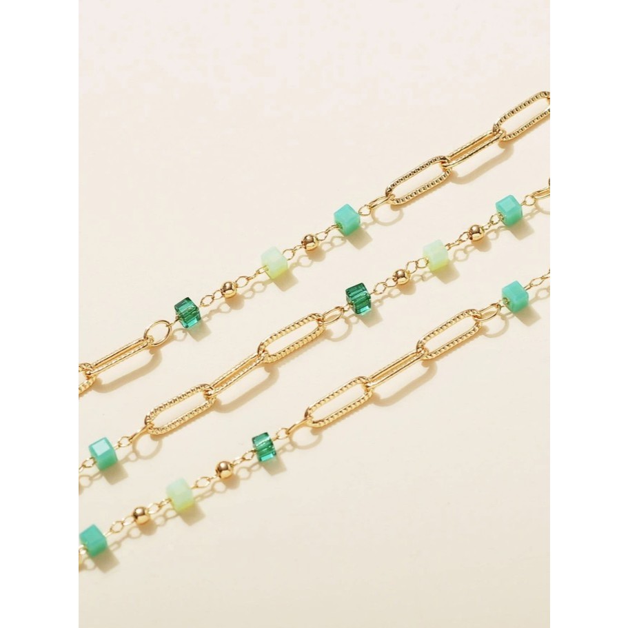 สร้อยคอแบบโซ่ แซมด้วยลูกปัดสีเขียวหลายเฉดสดใสมากๆ ลูกปัดตัดกับอะไหล่ทอง ทำให้ใส่ได้กับทุกลุค หญิงชายใส่ได้หมด