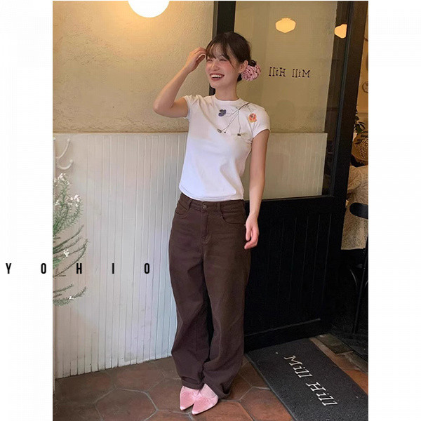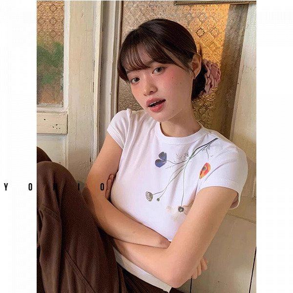 ผู้หญิงฤดูร้อนเก๋สลิมฟิตอเมริกันดอกไม้พิมพ์แขนสั้นเสื้อยืด