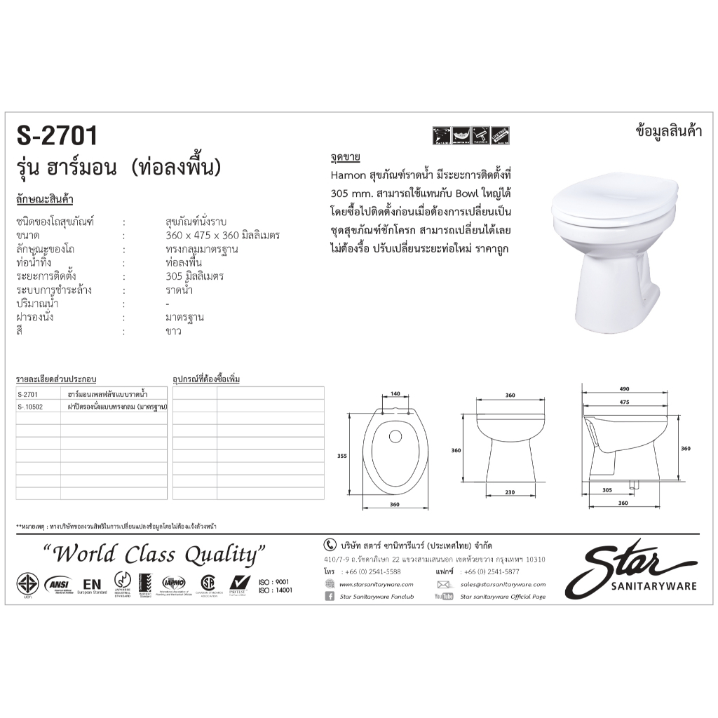 Star สุขภัณฑ์นั่งราบ รุ่น S-2701 ฮาร์ม่อน ท่อหน้า