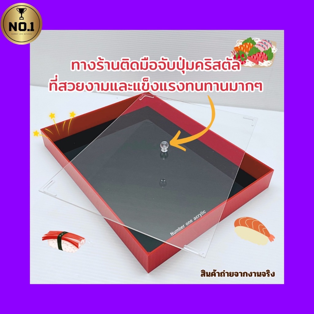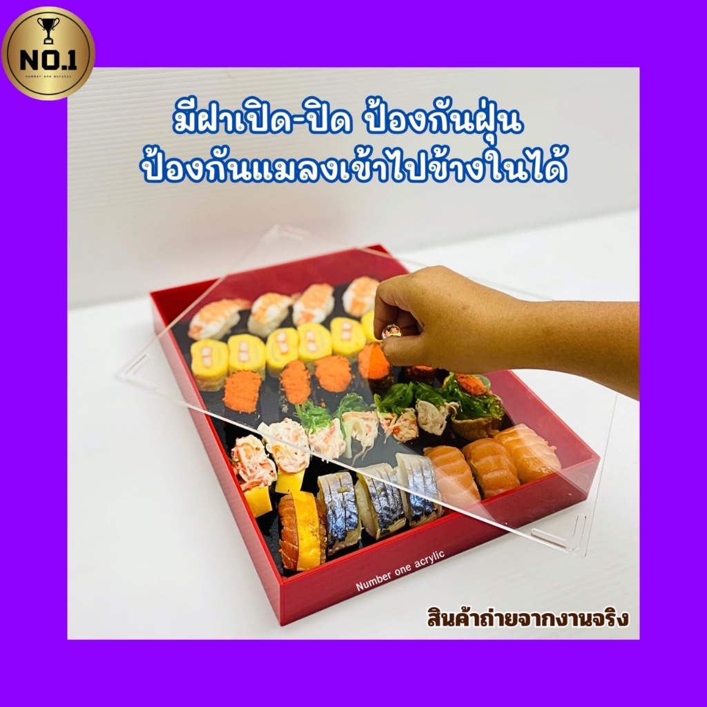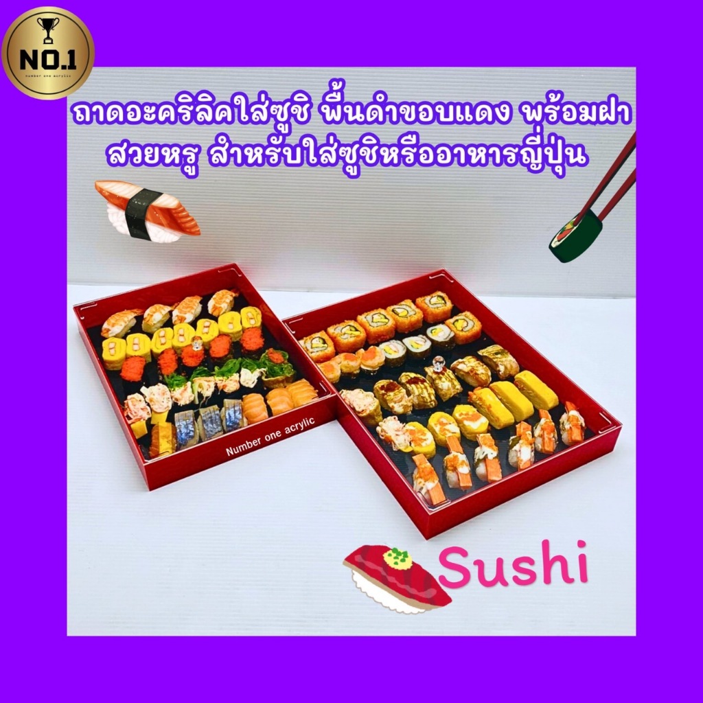 ถาดอะคริลิคใส่ซูชิ พื้นดำขอบแดง รุ่นมีฝาเปิด-ปิด ป้องกันแมลง มี 3 ขนาดให้เลือก