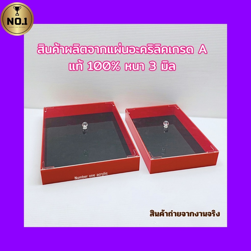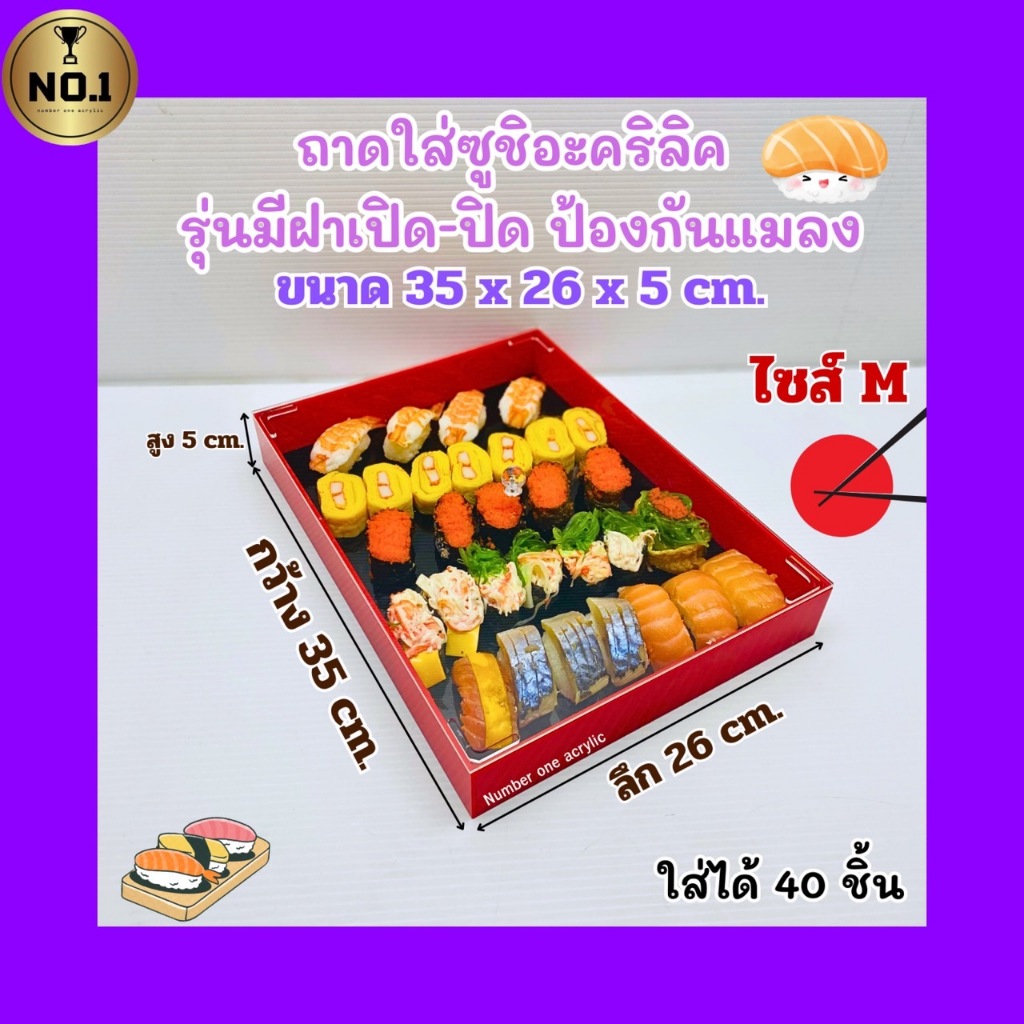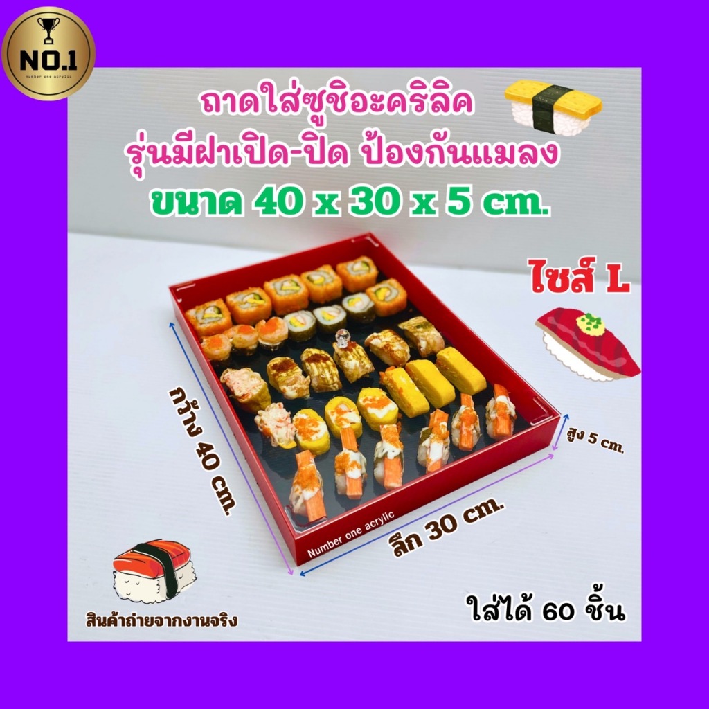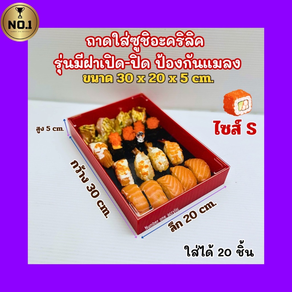 ถาดอะคริลิคใส่ซูชิ พื้นดำขอบแดง รุ่นมีฝาเปิด-ปิด ป้องกันแมลง มี 3 ขนาดให้เลือก