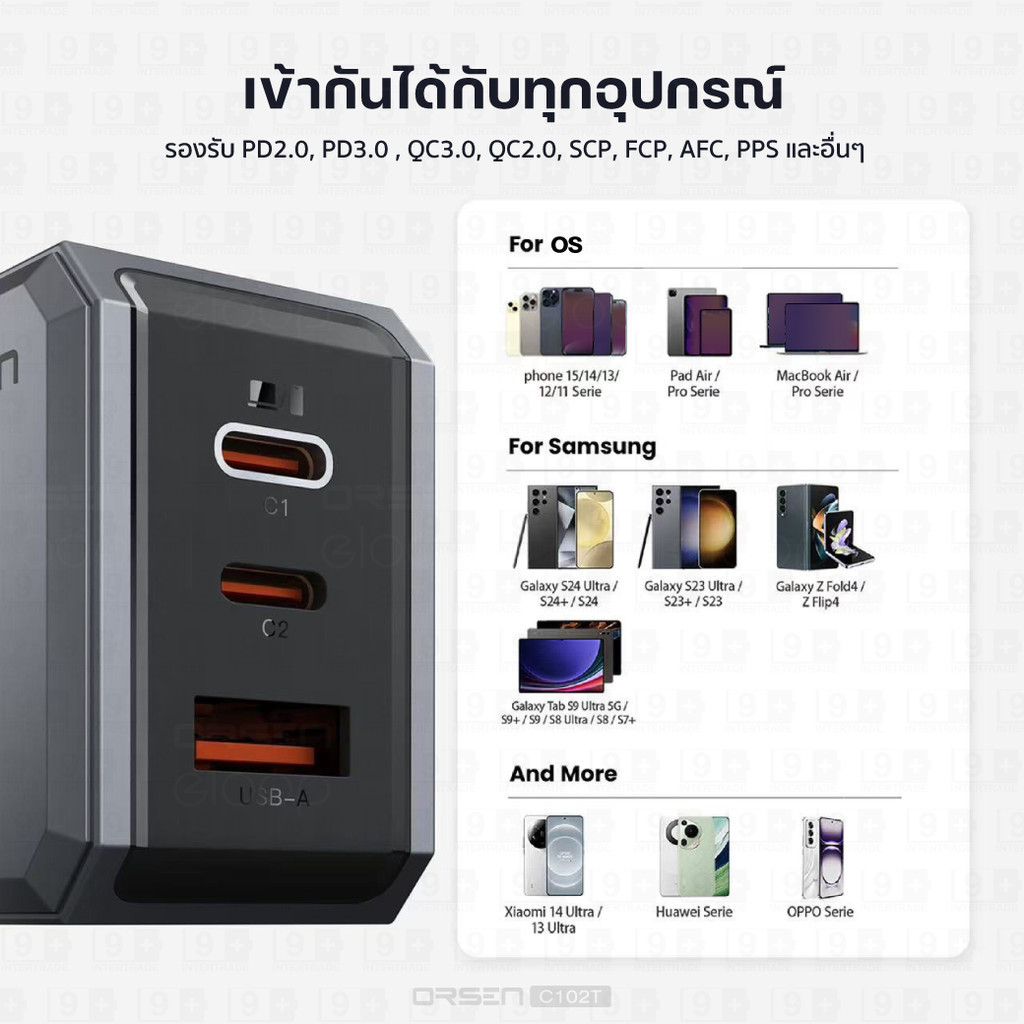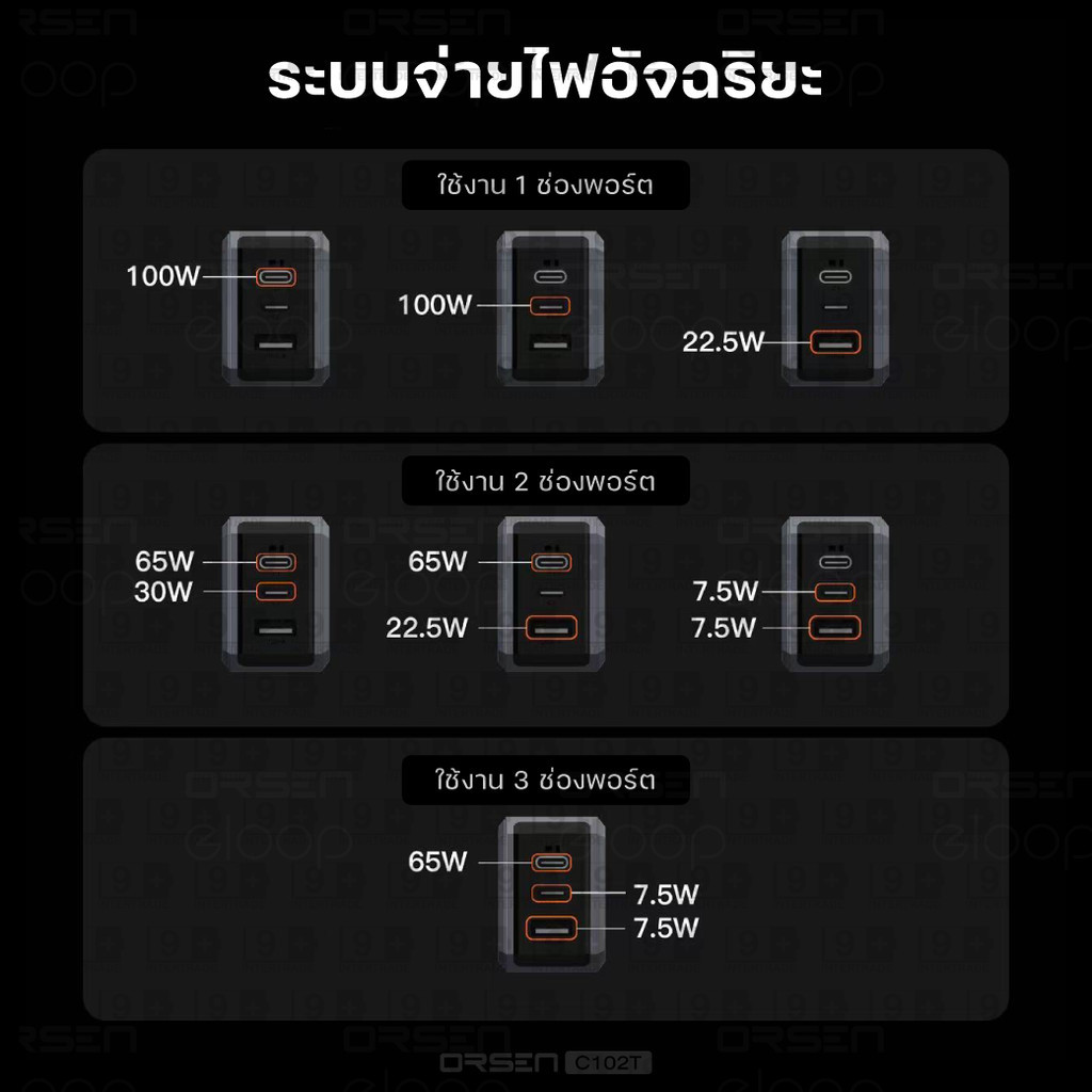 ・ Orsen by Eloop C102T หัวชาร์จเร็ว GaN 3 พอร์ต รองรับการชาร์จเร็วสูงสุดถึง 100W Max