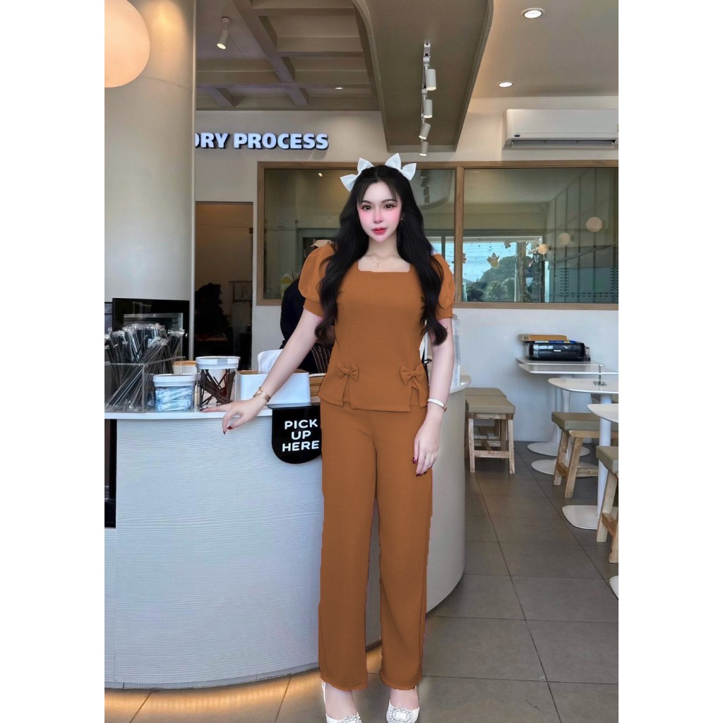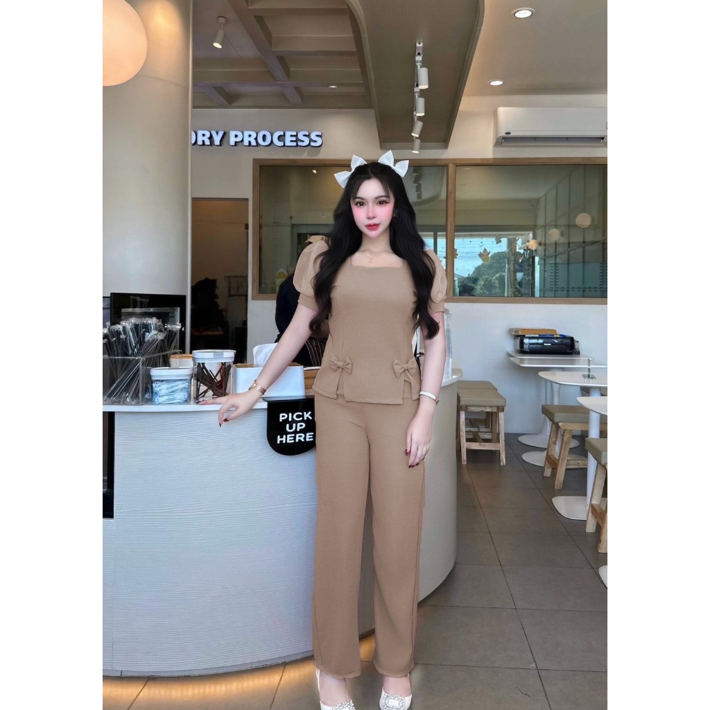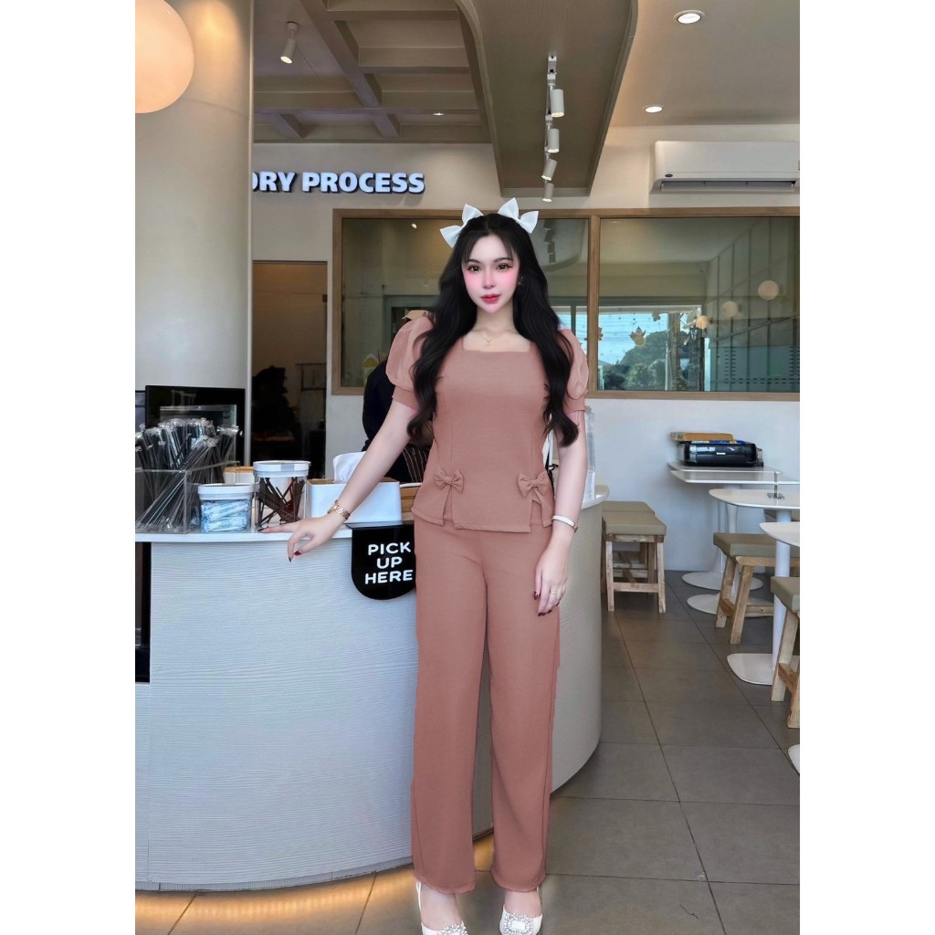 พร้อมส่ง ชุดเซตผ้าวูลเวฟ เสื้อแต่งแขนผ้าแก้วแต่งโบว์หน้า+กางเกง A4178