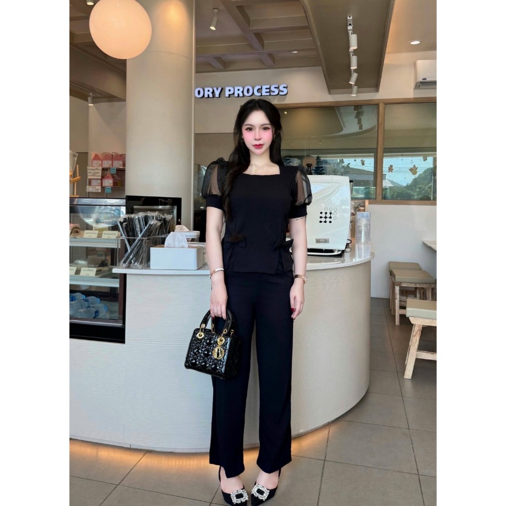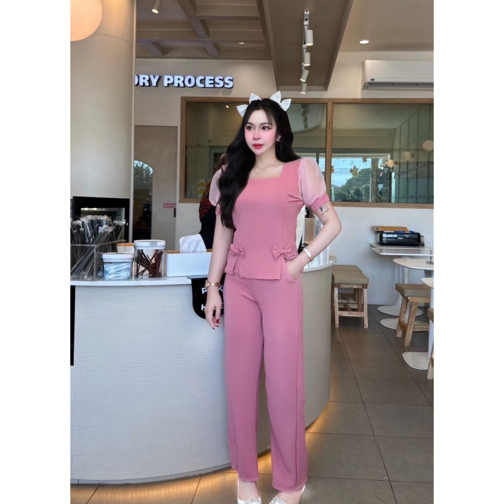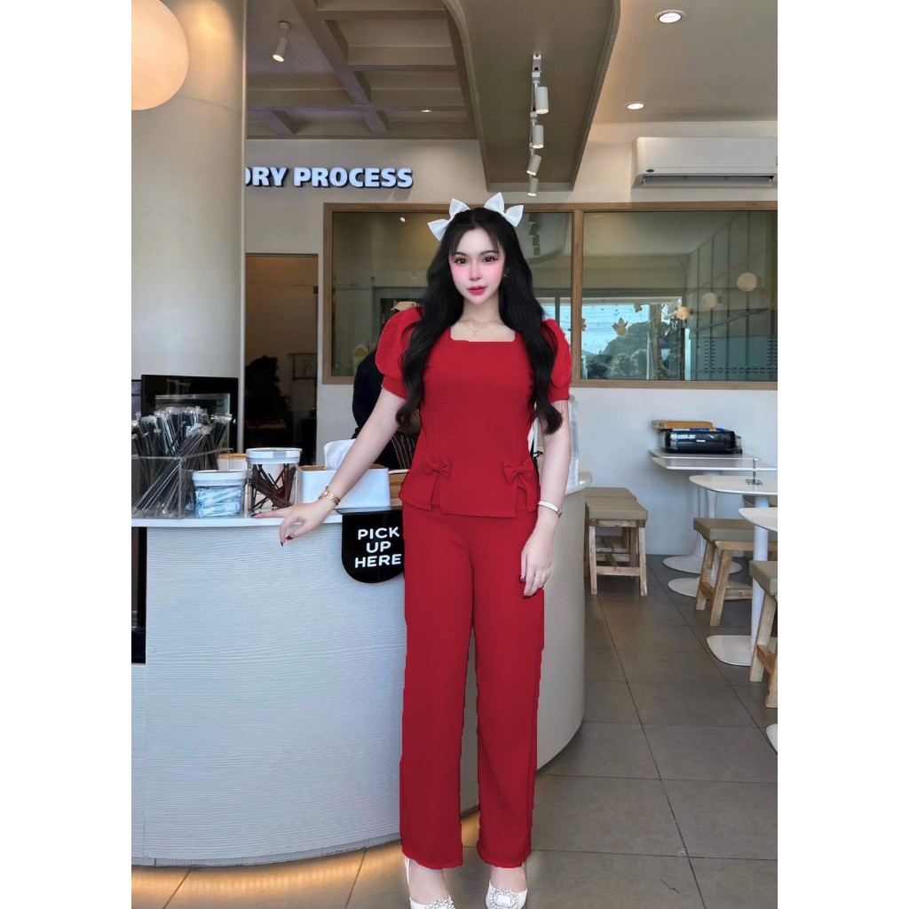 พร้อมส่ง ชุดเซตผ้าวูลเวฟ เสื้อแต่งแขนผ้าแก้วแต่งโบว์หน้า+กางเกง A4178