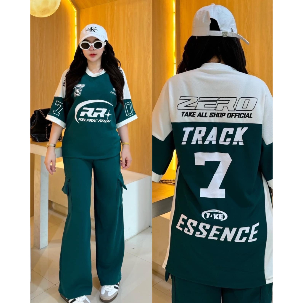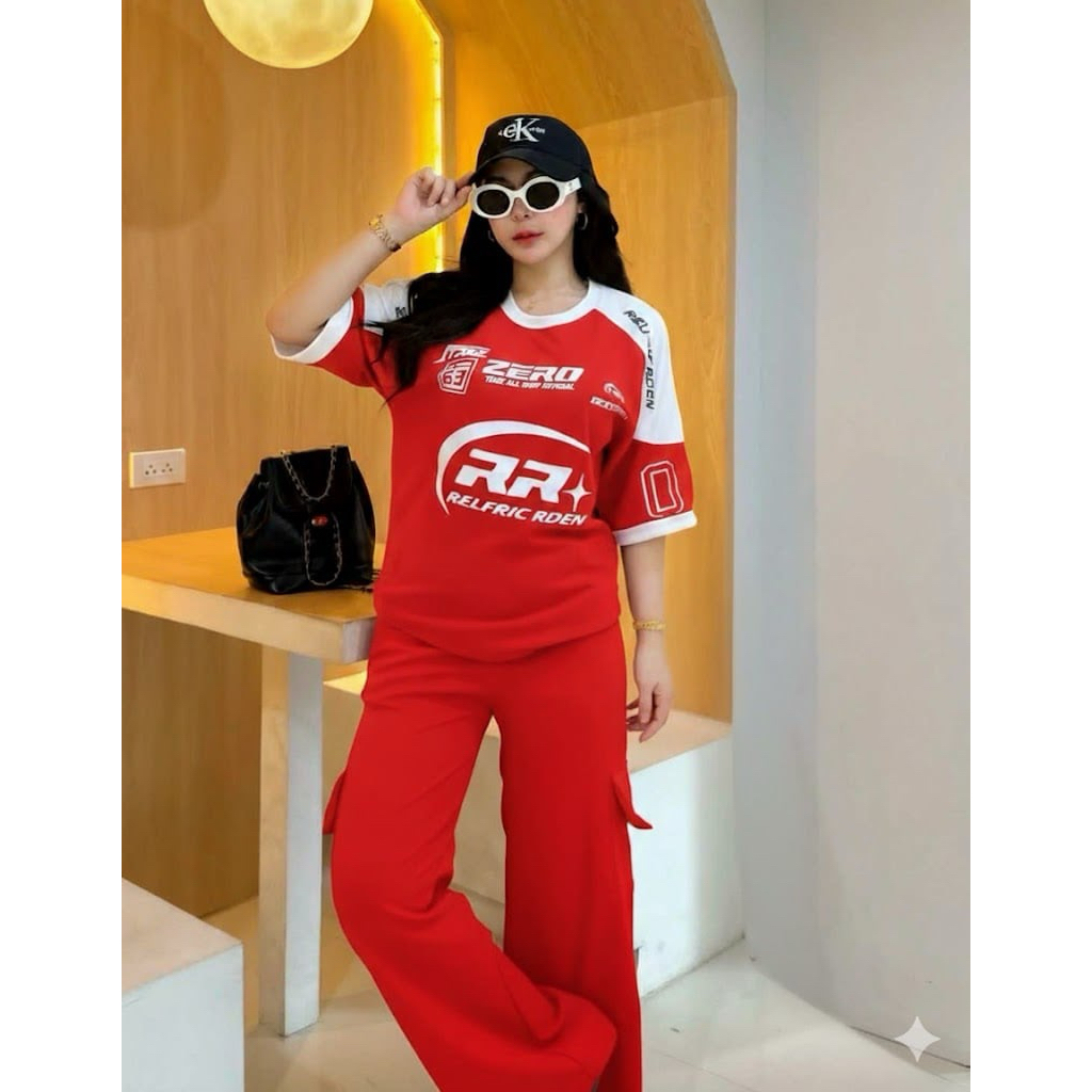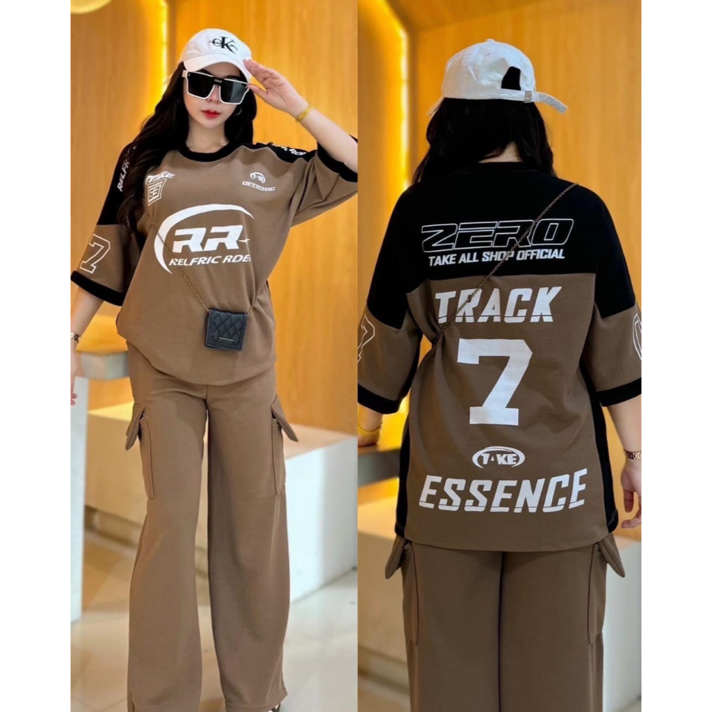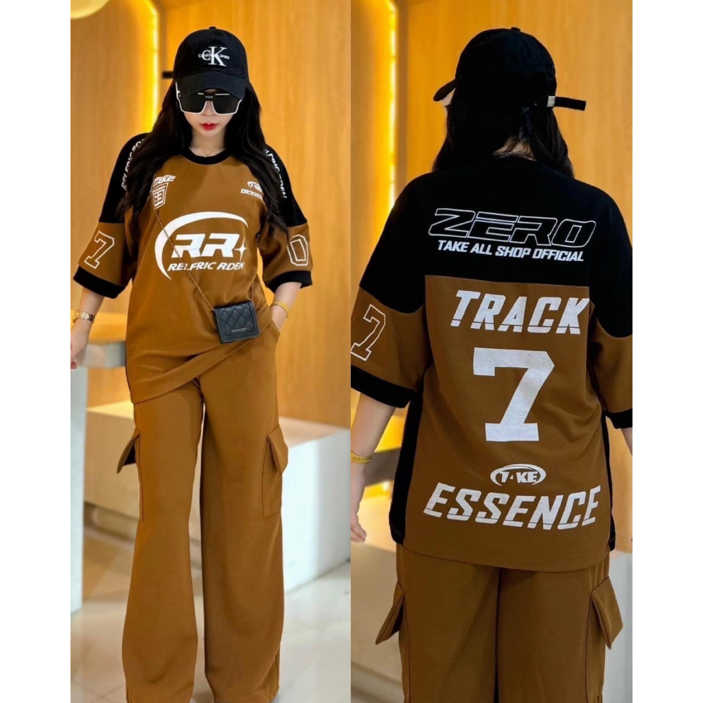 ฺBB ชุดเซ็ต 2 ชิ้น ผ้าวูลเวฟ เสื้อโอเวอร์ไซด์สกีนลายหน้าหลัง RR7 + กางเกงขายาวคาโก้ กระเป๋า 4 จุด เท่สุดๆ