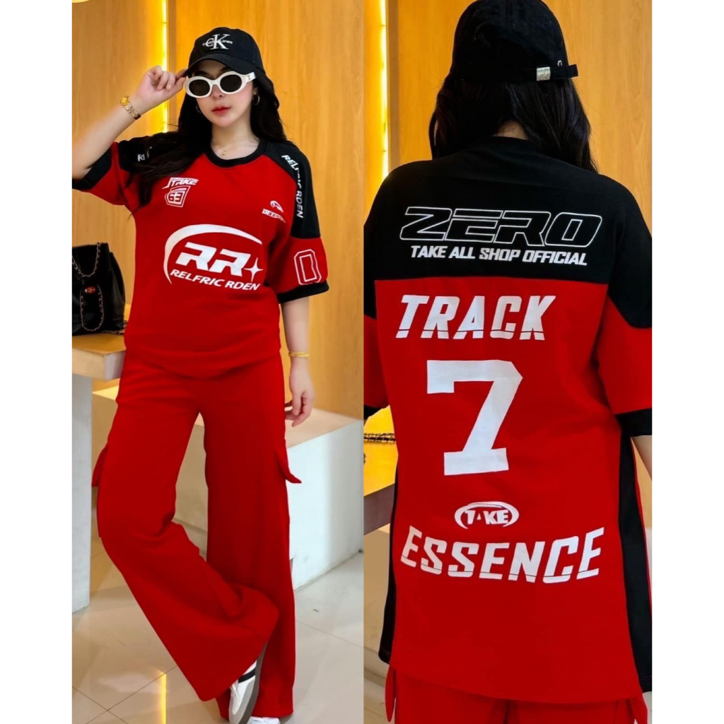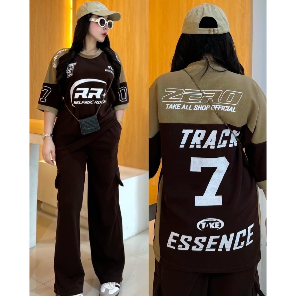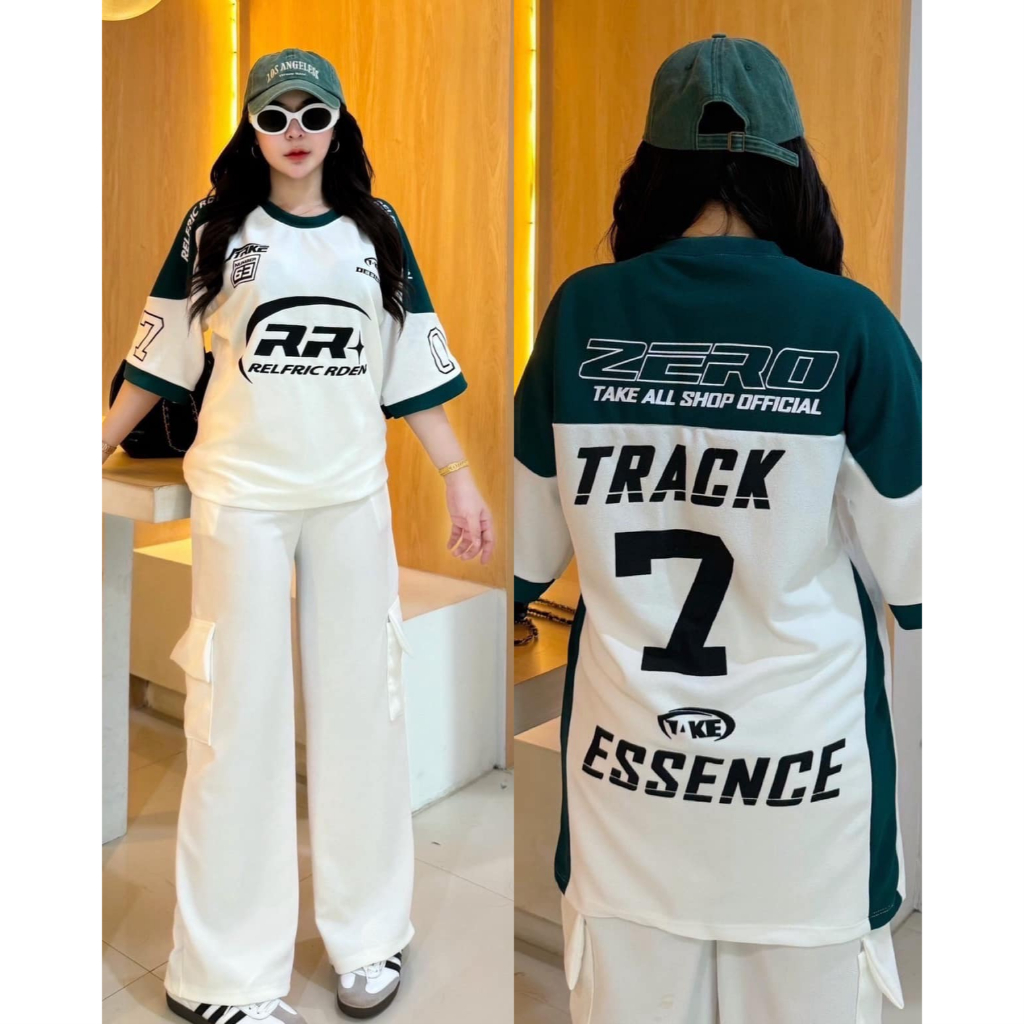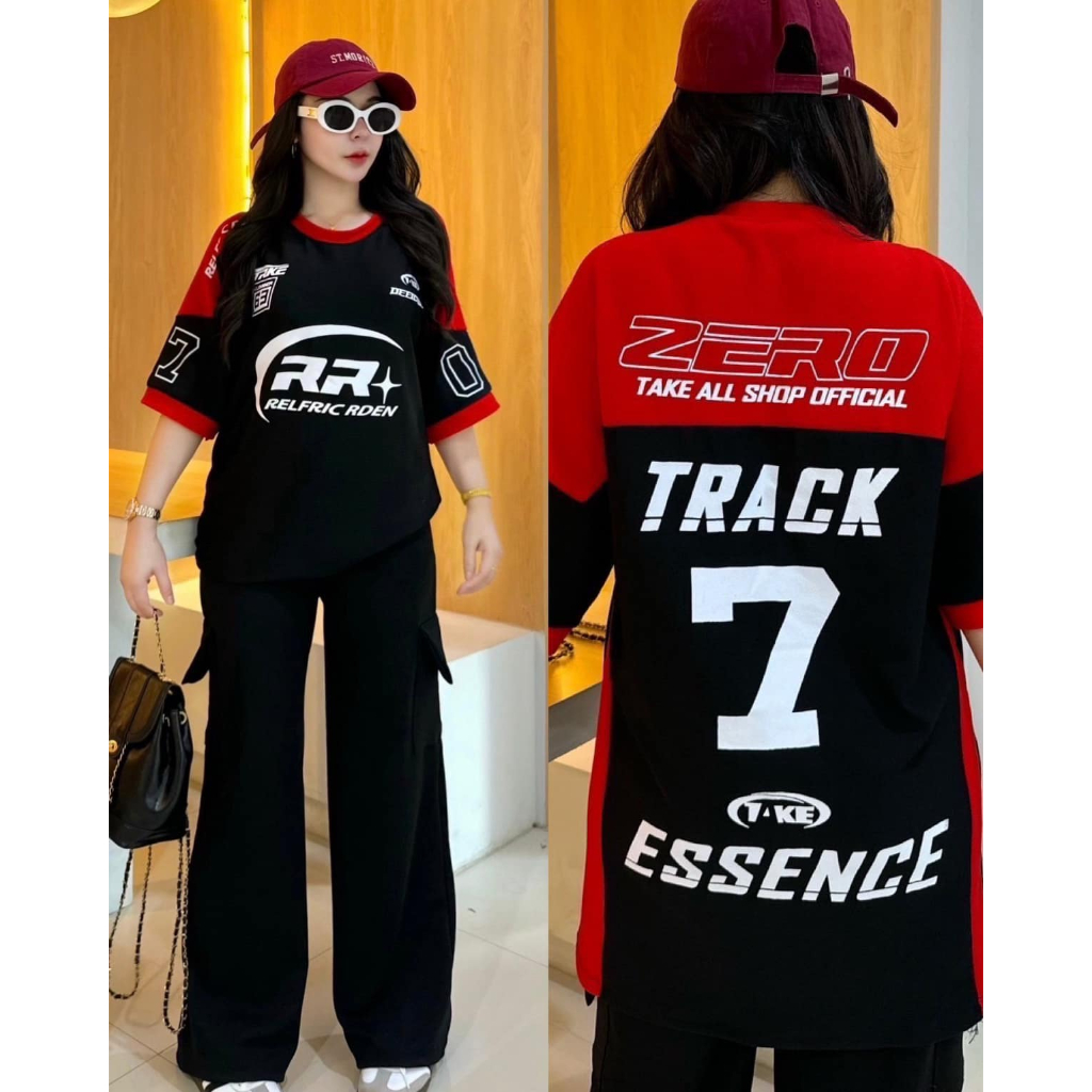 ฺBB ชุดเซ็ต 2 ชิ้น ผ้าวูลเวฟ เสื้อโอเวอร์ไซด์สกีนลายหน้าหลัง RR7 + กางเกงขายาวคาโก้ กระเป๋า 4 จุด เท่สุดๆ