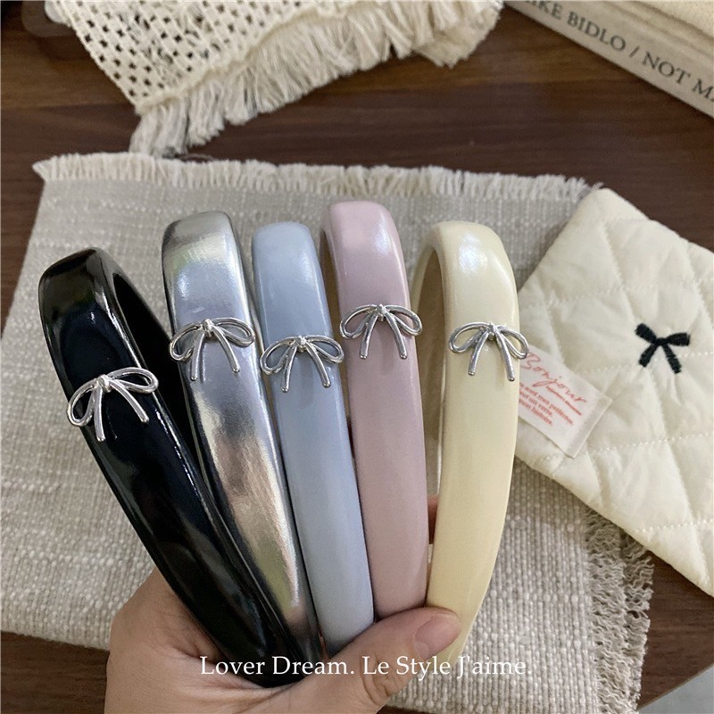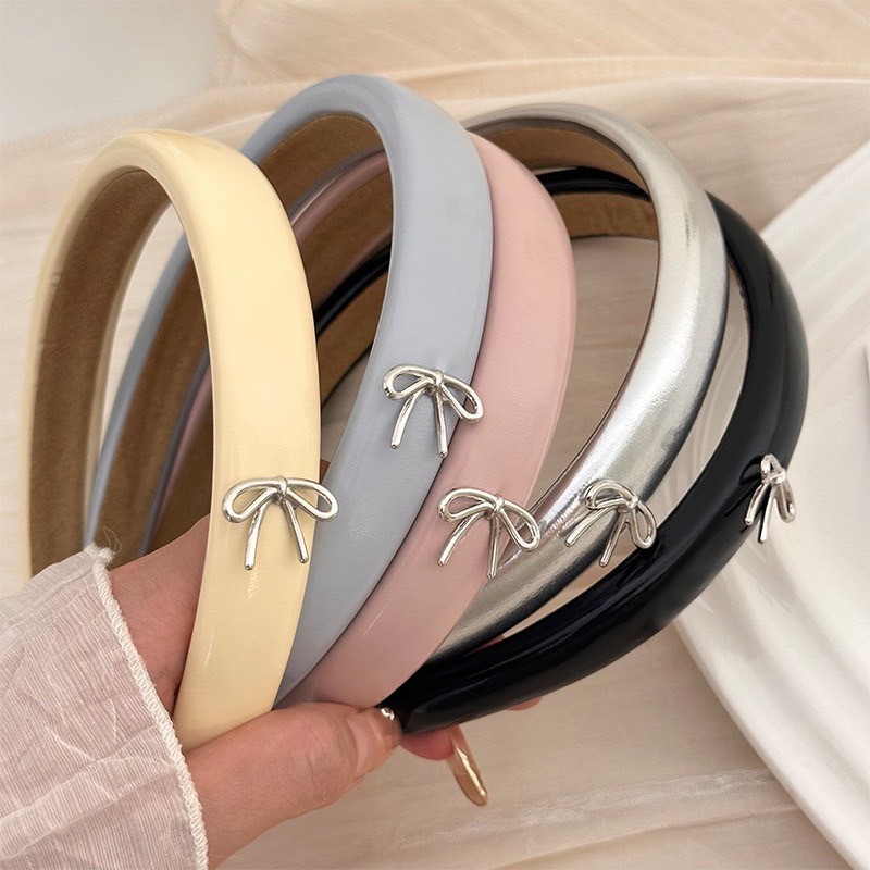 [PS-พร้อมส่งในไทย] ที่คาดผมแฟชั่นเกาหลีฟองน้ำหนัง ประดับด้วยโบว์สีเงิน ขนาด 14 cm. สีพาสเทล หนังนิ่ม ไม่ลอก ไม่กินเส้นผ
