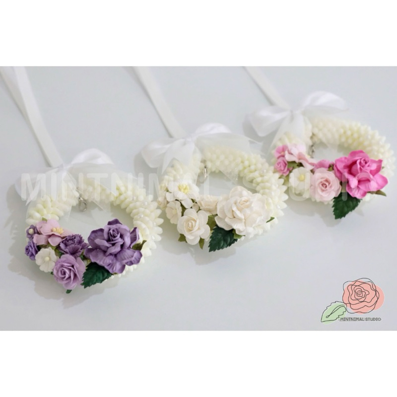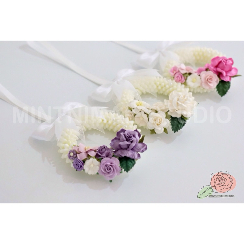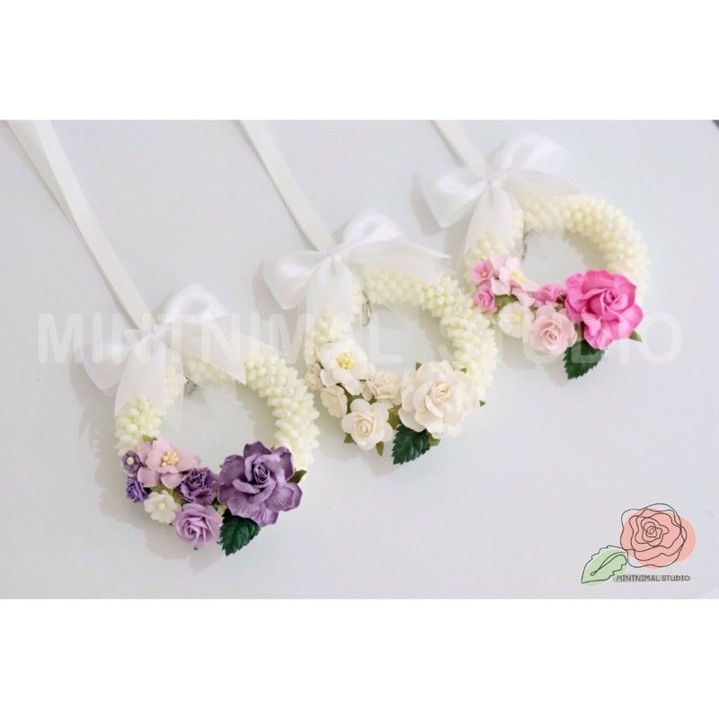ตัวมาลัยทำจากจากวงมะลิ ประดับด้วยไข่มุก พร้อมด้วยดอกไม้ประดิษฐ์