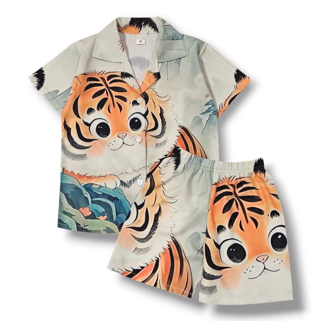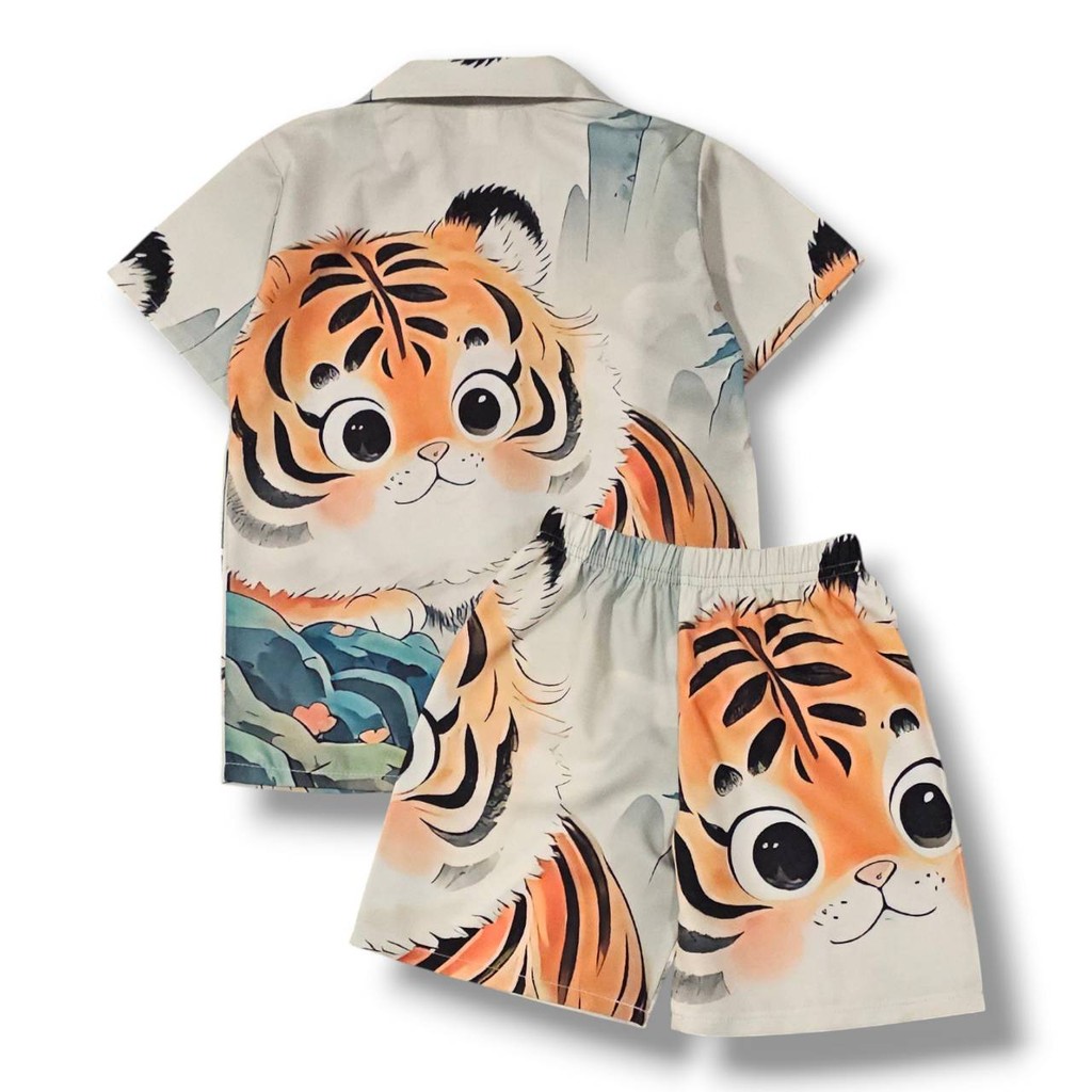 TG0918#6 ชุดเด็ก เซ็ตเสื้อฮาวาย+กางเกงขาสั้น ผ้าไหมอิตาลีเกรดเอ ลายเสืออ้วน เสื้อผ้าเด็กแฟชั่น ชุดเด็กลายการ์ตูน