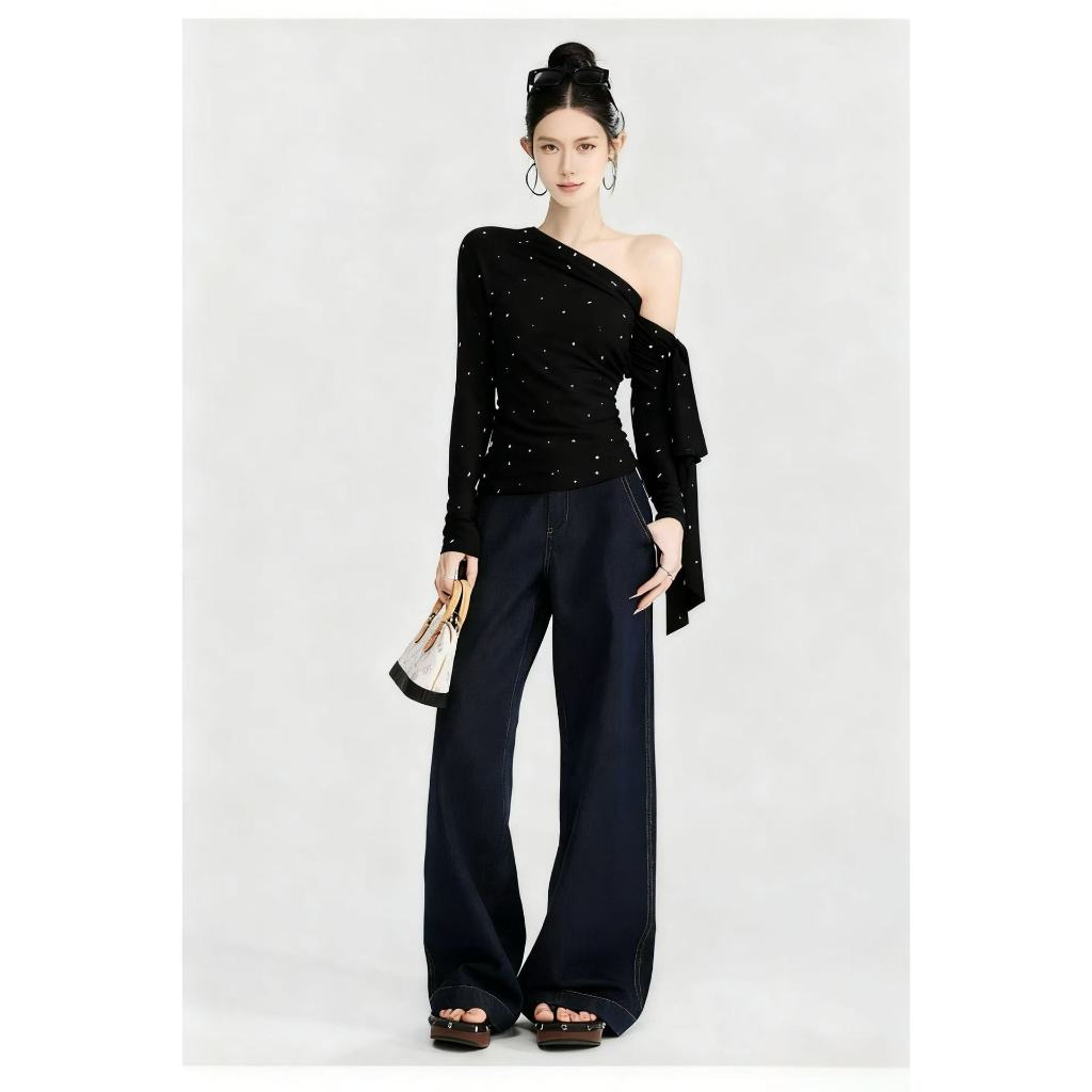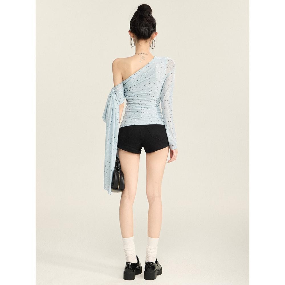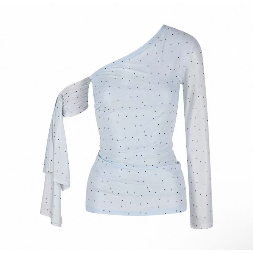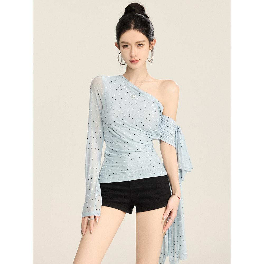 SUN?️พร้อมส่ง?️เสื้อท็อปลายจุดทรงเข้ารูปฤดูใบไม้ร่วงสำหรับผู้หญิง ดีไซน์ไหล่ไม่สม่ำเสมอ และเสื้อเชิ้ตแขนยาว