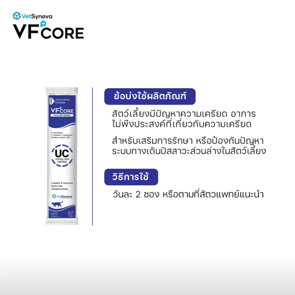 VF+core UC แมวเลีย สุนัขเลีย สูตรลดความเครียด และรักษาระบบทางเดินปัสสาวะ สำหรับสุนัขและแมว 1 กล่อง ( 30 ซอง)