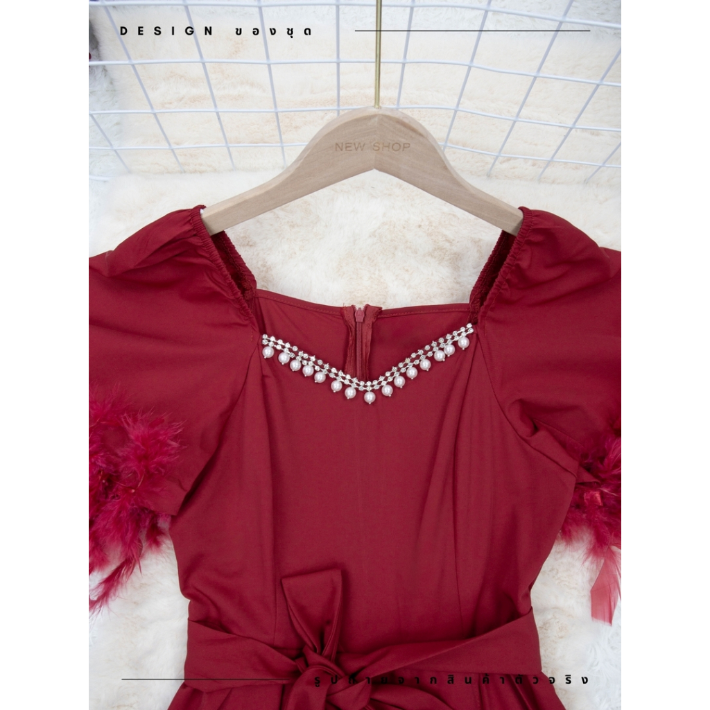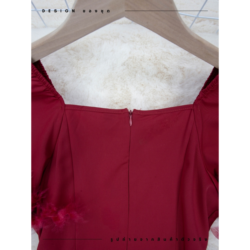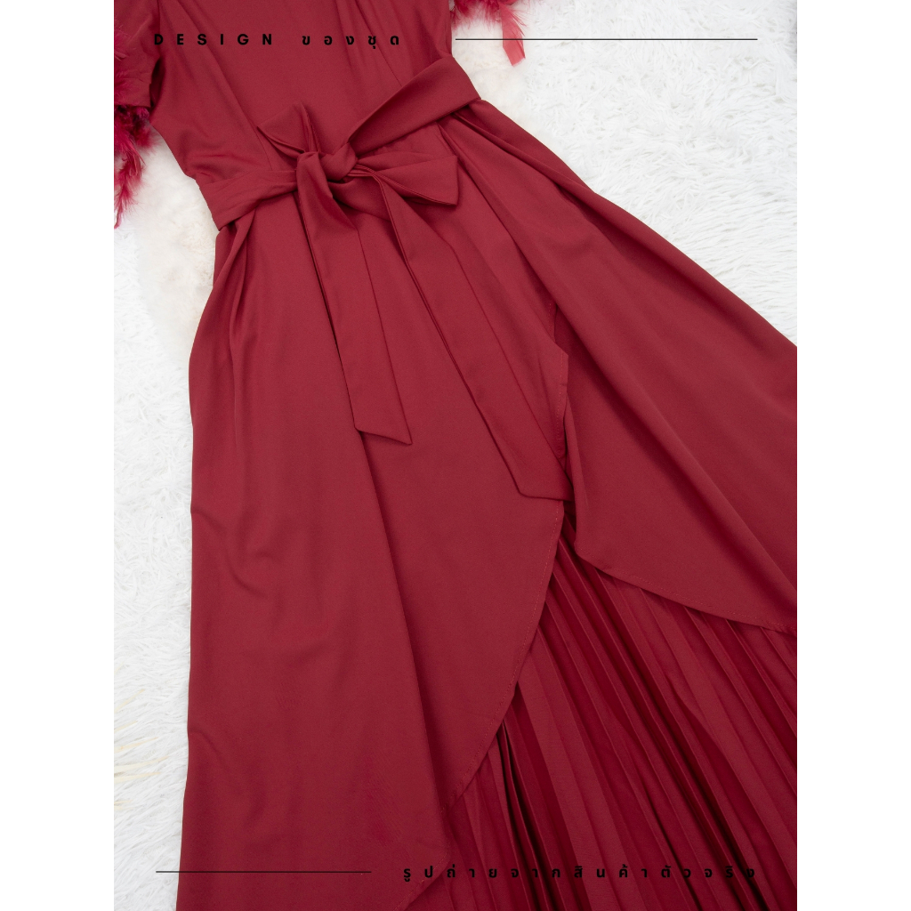 ชุดเดรสสง่างาม,ชุดเดรสออกงาน สีแดงเบอร์กันดี้ ซิปซ่อนด้านหลัง แขนกระดิ่ง ผ้าโพลีเอสเตอร์