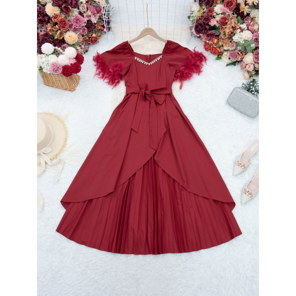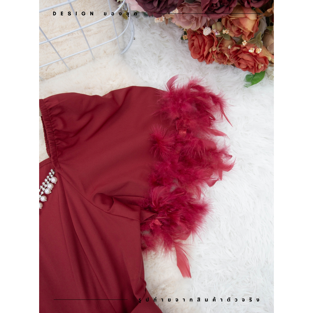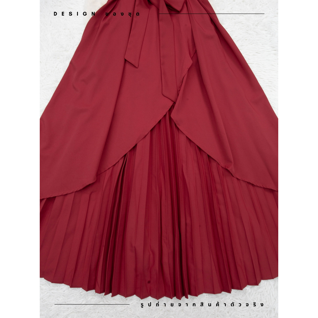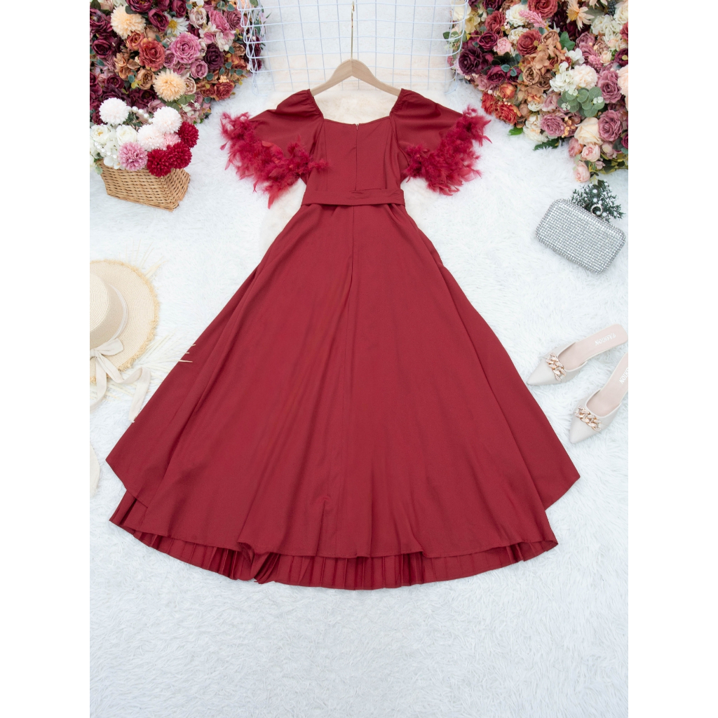 ชุดเดรสสง่างาม,ชุดเดรสออกงาน สีแดงเบอร์กันดี้ ซิปซ่อนด้านหลัง แขนกระดิ่ง ผ้าโพลีเอสเตอร์