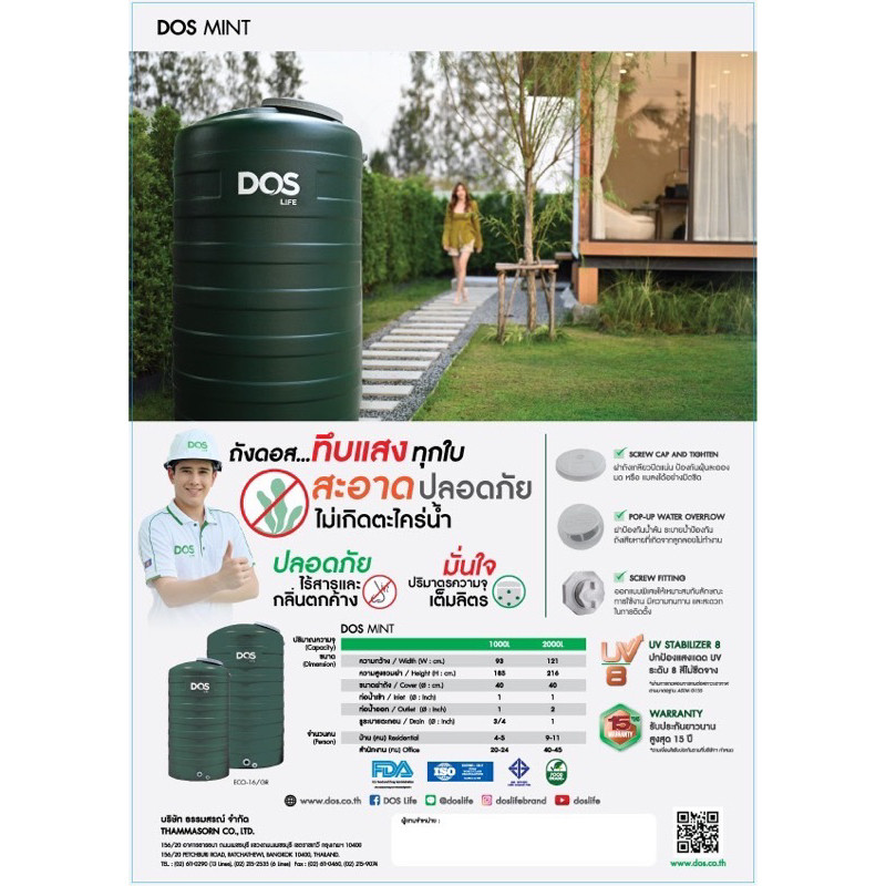 ส่งด่วน! DOS ถังเก็บน้ำบนดิน MINT ขนาด 1000ลิตร ทึบแสง กันตะไคร่น้ำ รับประกัน 15 ปี