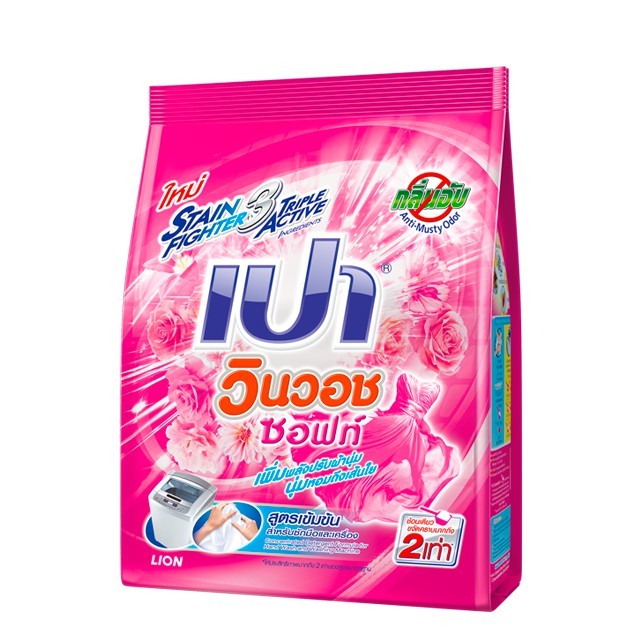 สีชมพู ผงซักฟอก เปา วินวอช ซอฟท์ ใหม่STAIN FIGHTER TRIPLE ACTIVE รวม 3 พลังสารทำความสะอาดสูตรเข้มข้น ขจัดคราบหนักซักยาก คืนความสะอาดให้ผ้าอย่างง่ายๆถึงเส้นใย ให้ผ้าขาวสะอาดดูเหมือนใหม่ และช่วยลดกลิ่นอับแม้ตากไม่โดนแดด พร้อมเพิ่มพลังปรับผ้านุ่ม ถนอมเส้นใย