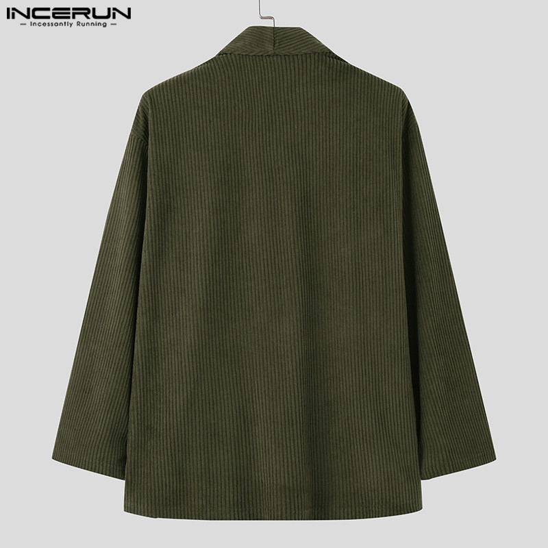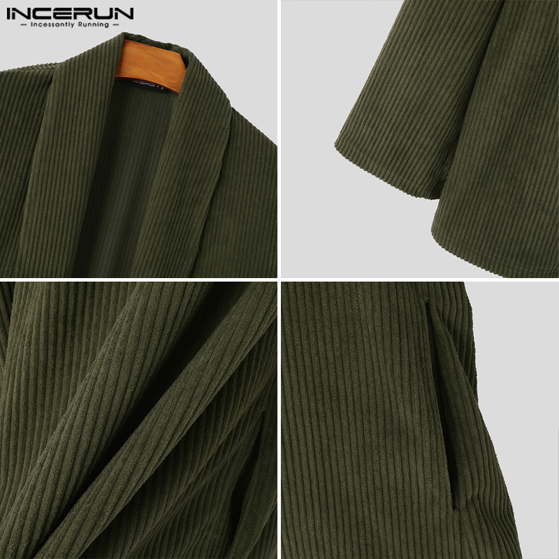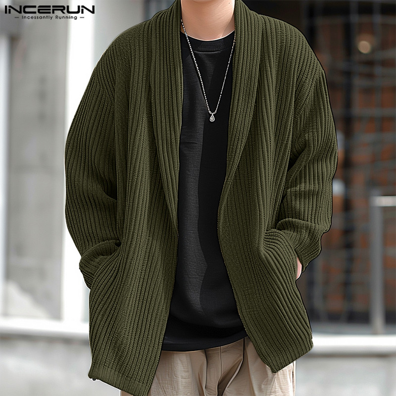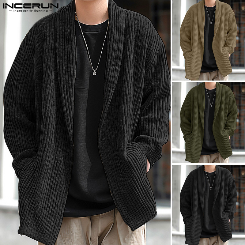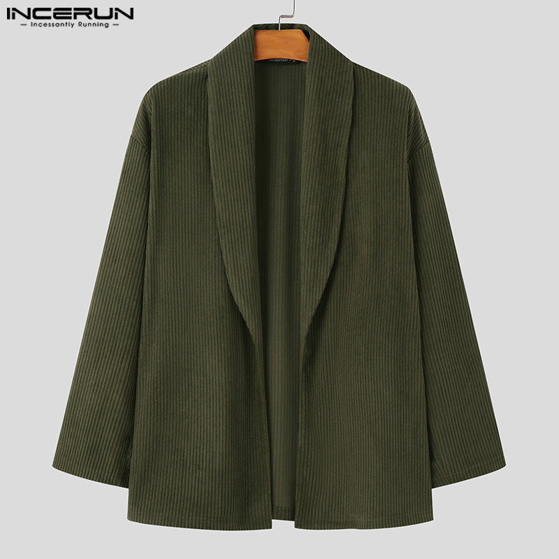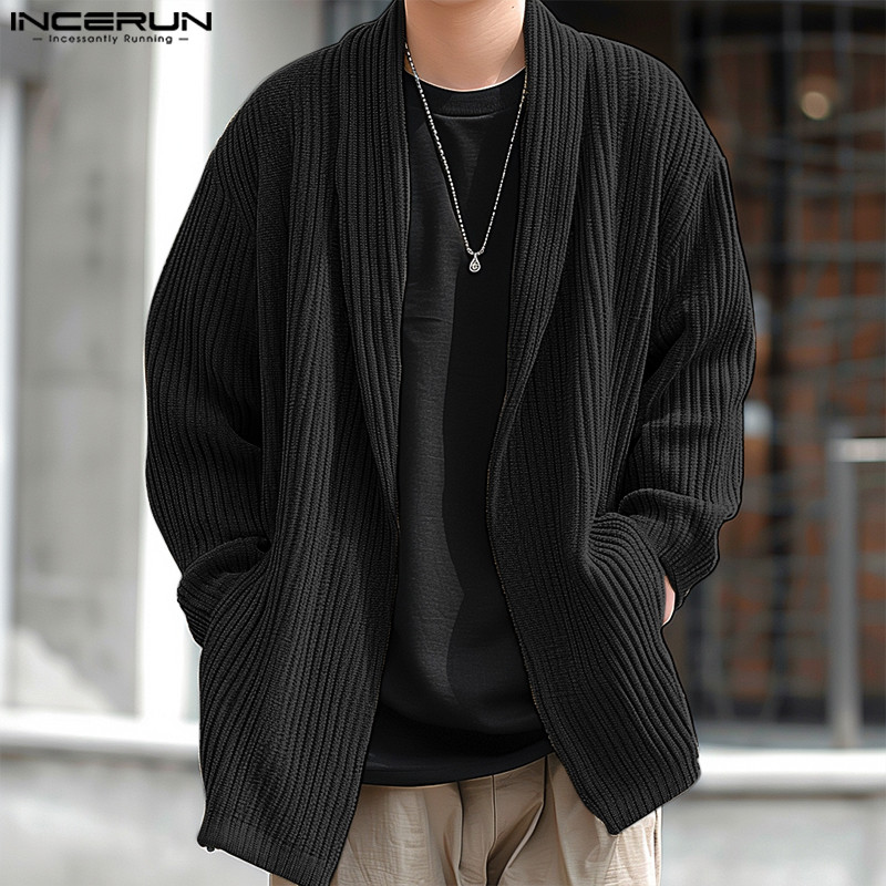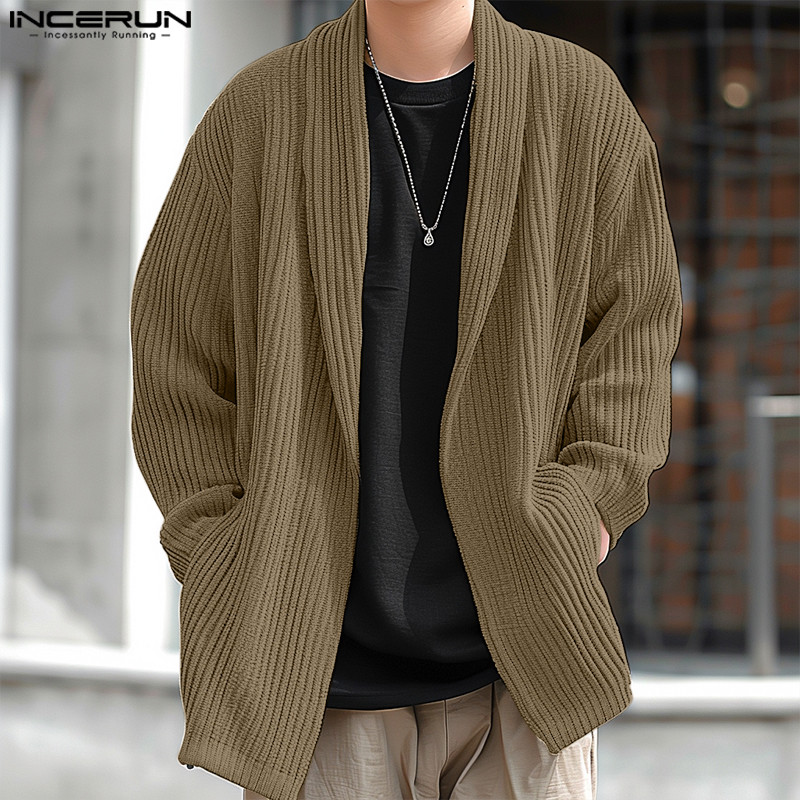 ไม่แน่นอน ผู้ชายแฟชั่นเกาหลีลายแขนยาวหลวมสีทึบกิโมโน
