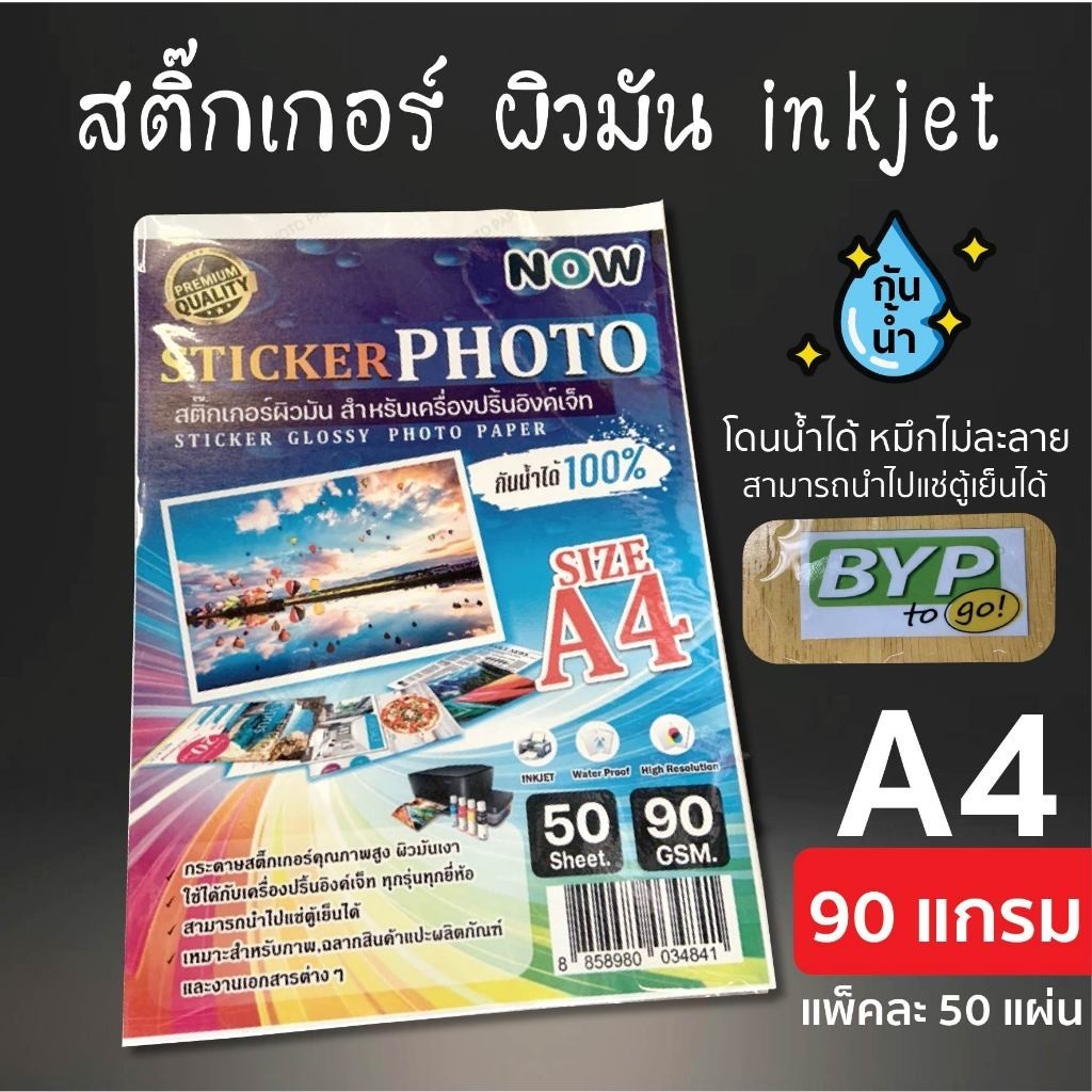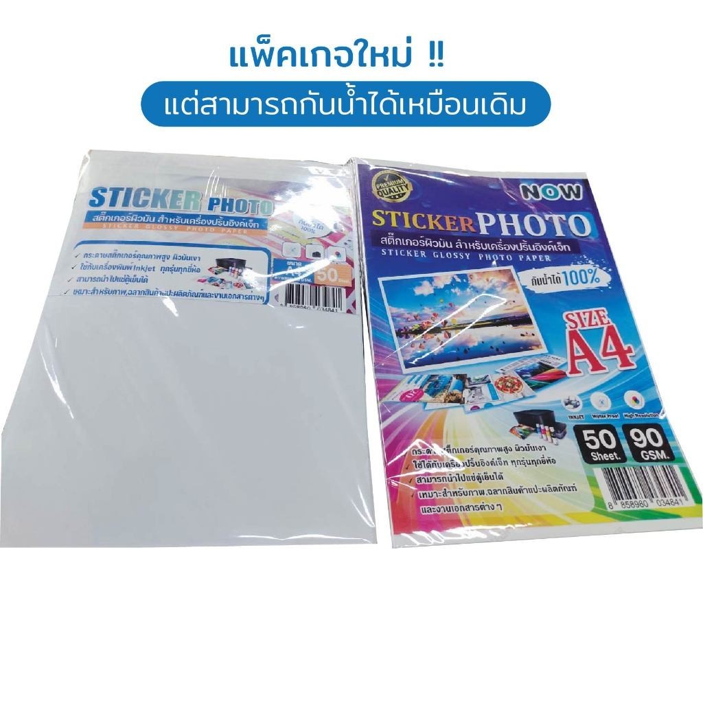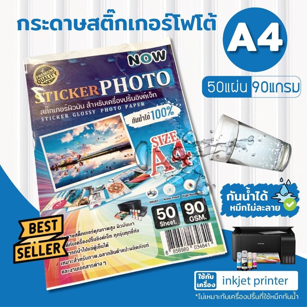 สติ๊กเกอร์โฟโต้ A4 ผิวมันเงา ผิวมันกันน้ำ (50แผ่น) 90 แกรม สำหรับเครื่องปริ้น inkjet กันน้ำได้ , สติ๊กเ