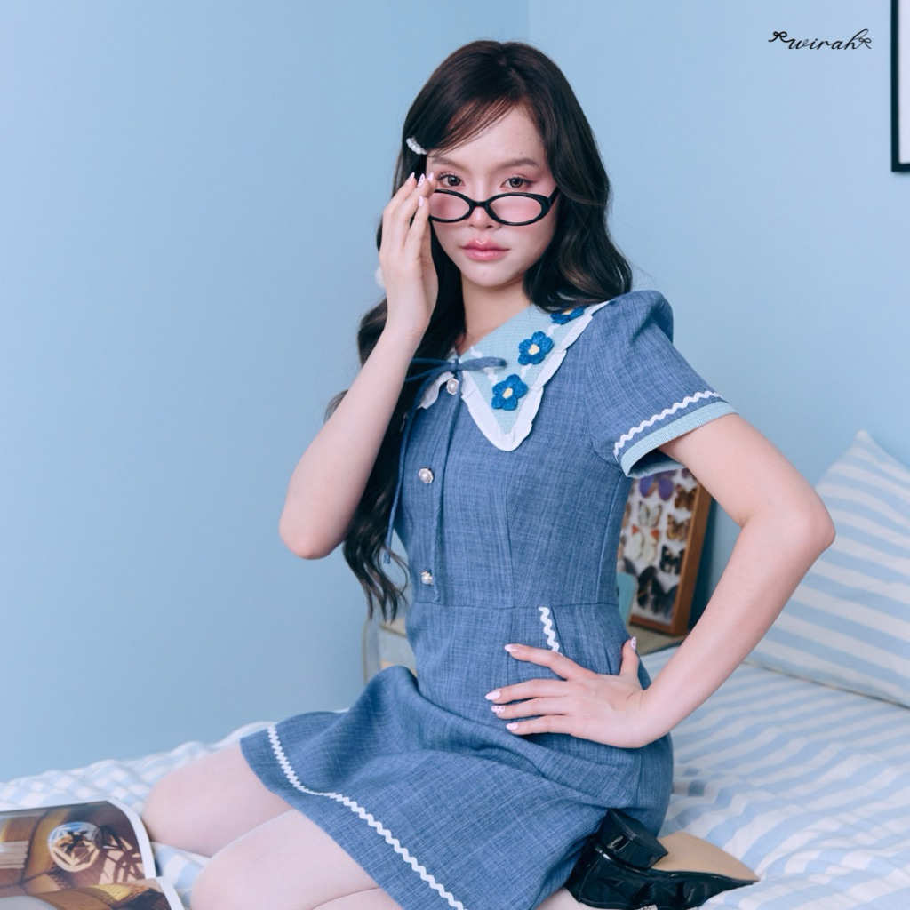 ชุดเดรสผ้าทอทวิตสีพื้น ปกบัวแหลมผ้าทอทวิตลายตารางสลับสีแต่งเทปซิกแซกเย็บทาปบนปกและดอกไม้ไหมพรม3Dบนปก และแต่งระบายผ้าพื้นโดยรอบปก ด้านหน้าติดกระดุมหลอก ที่คอเสื้อแต่งโบว์ผูกผ้าตัว (สามารถผูกเองแต่ถอดไม่ได้) แขนสั้นผ้าทวิตตัดต่อขอ