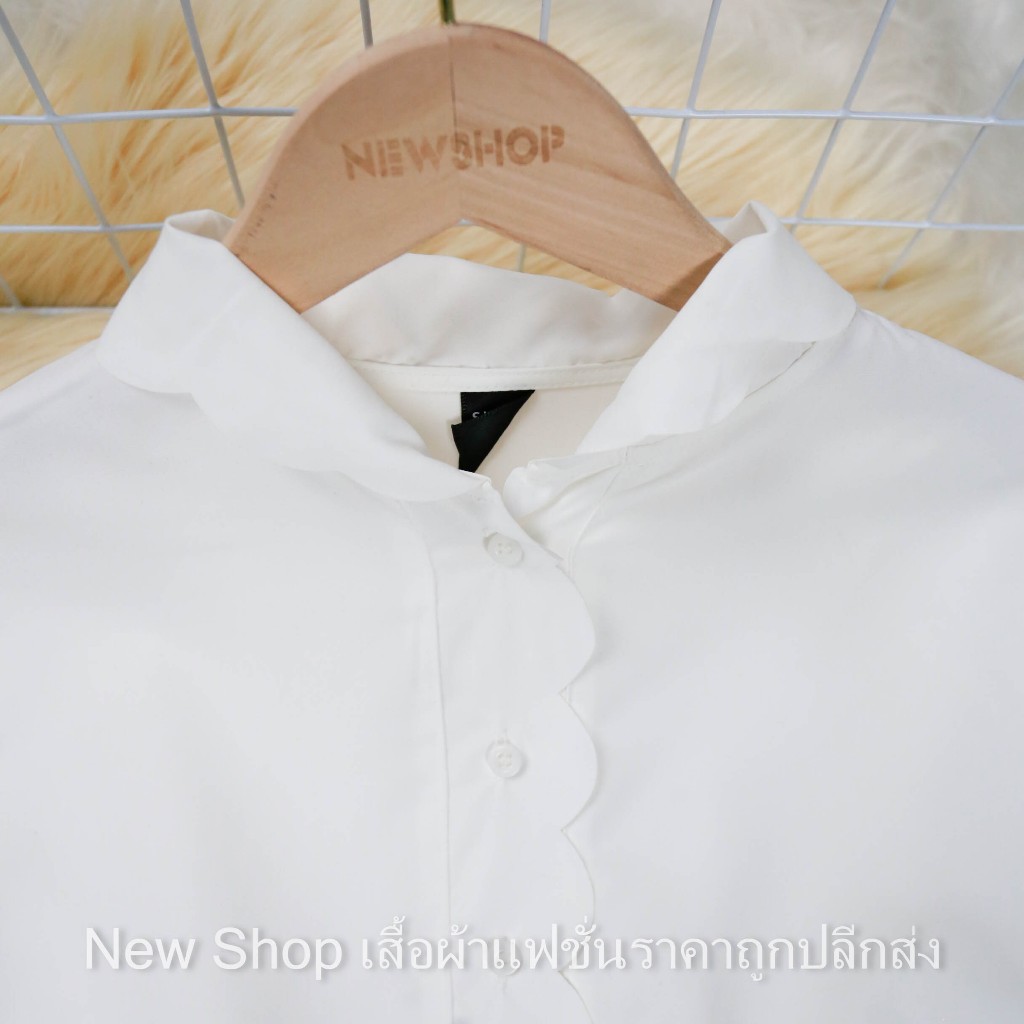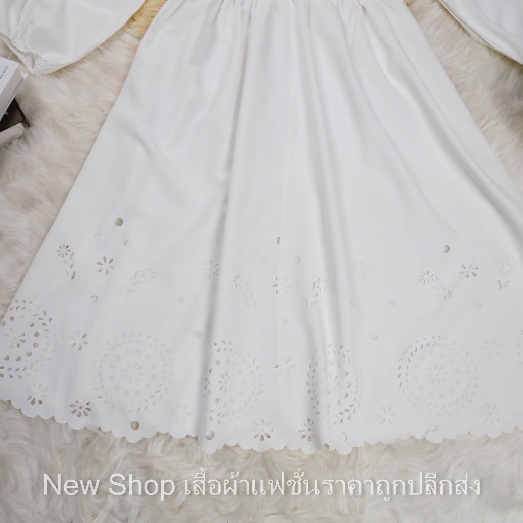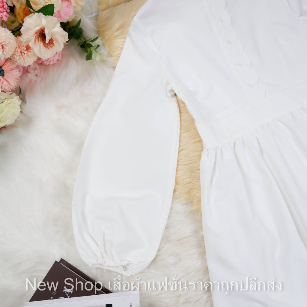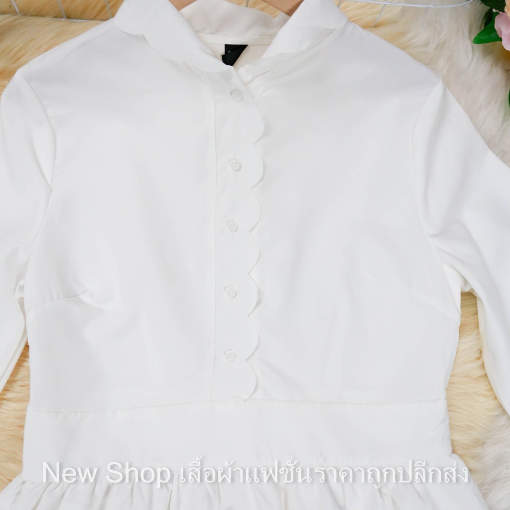 ชุดเดรส สีขาว คอปกหยัก แขนยาว ความยาวชุด=48