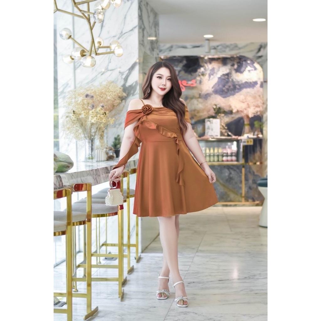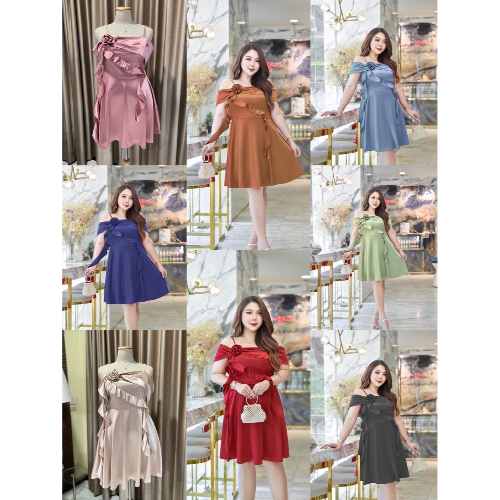 เดรสสั้น ดีเทลสวย มีดอกไม้เย็บเอง ผ้าซาติน เกรดพรีเมี่ยม ยืดหยุ่นได้ดี พร้อมซิปหลัง กระโปรงพริ้ว ใส่สวย ปิดเเขน