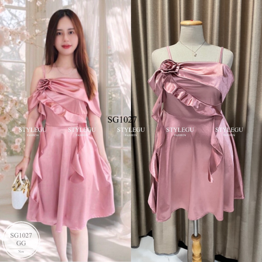 ES1027 เดรสสั้น ดีเทลสวย มีดอกไม้เย็บเอง ผ้าซาติน เกรดพรีเมี่ยม ยืดหยุ่นได้ดี พร้อมซิปหลัง
