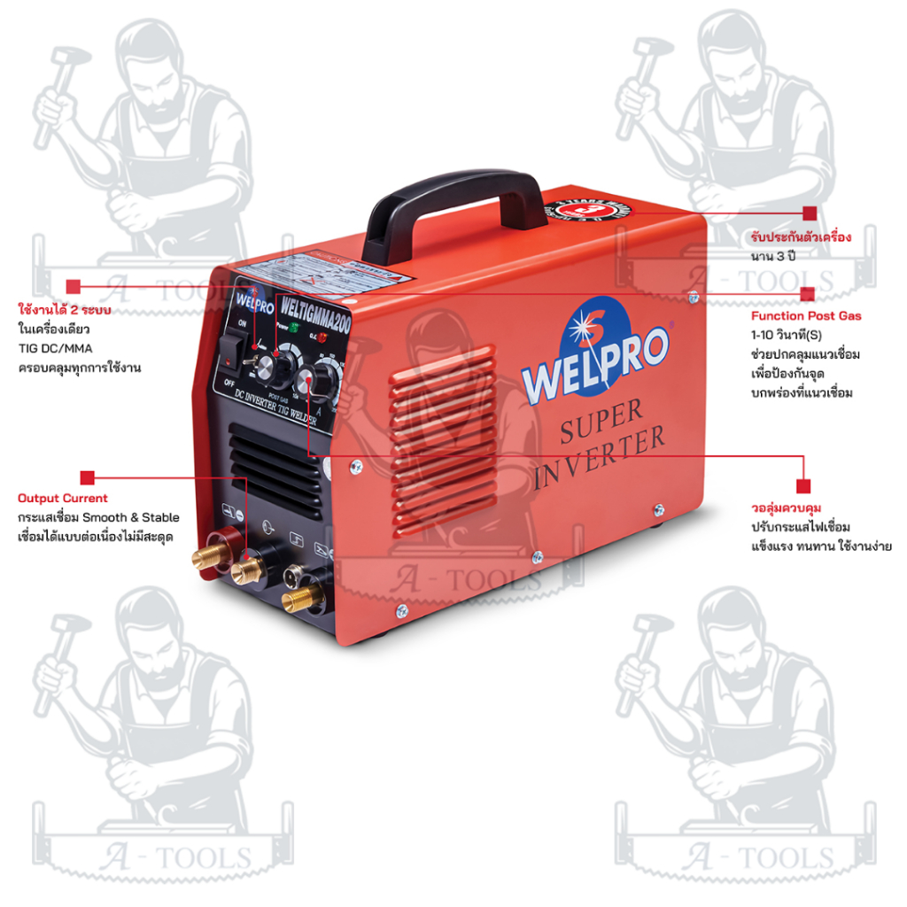 WELPRO ตู้เชื่อมอินเวอร์เตอร์ 2ระบบ TIG/MMA รุ่น WELTIG MMA 200 แถมหมวกเชื่อม รับประกัน 3 ปี ของแท้ 100% พร้อมส่ง