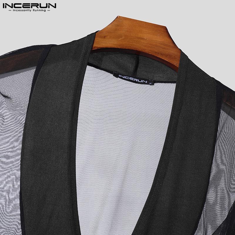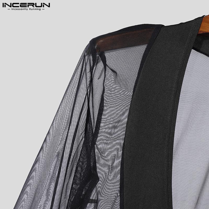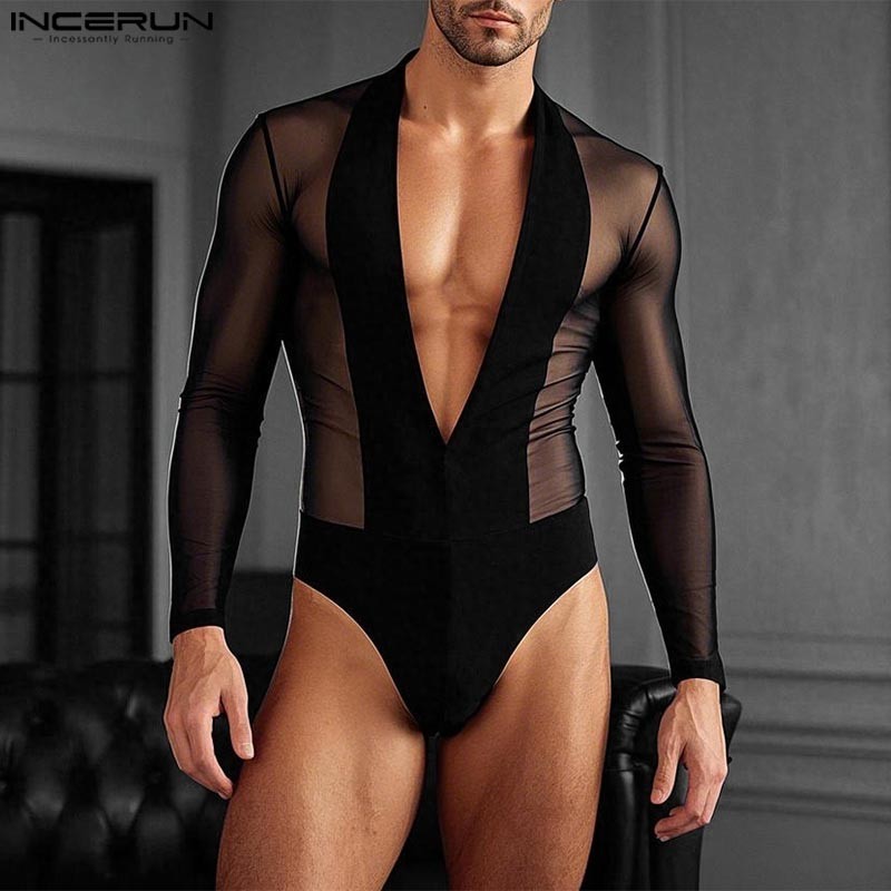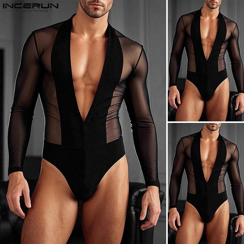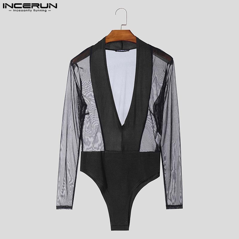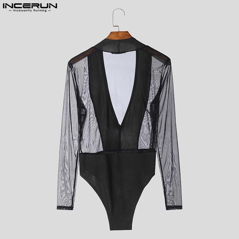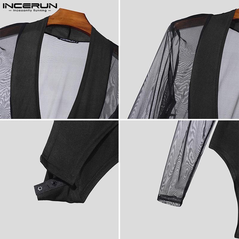 Incerun ผู้ชาย Vintage Clubwear Party Deep V ตาข่าย Splicing ชุดบอดี้สูทแขนเต็มรูปแบบ