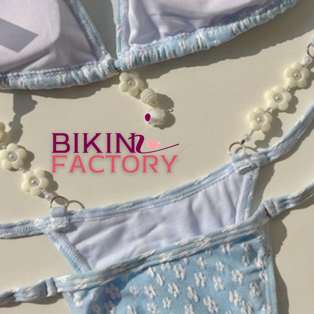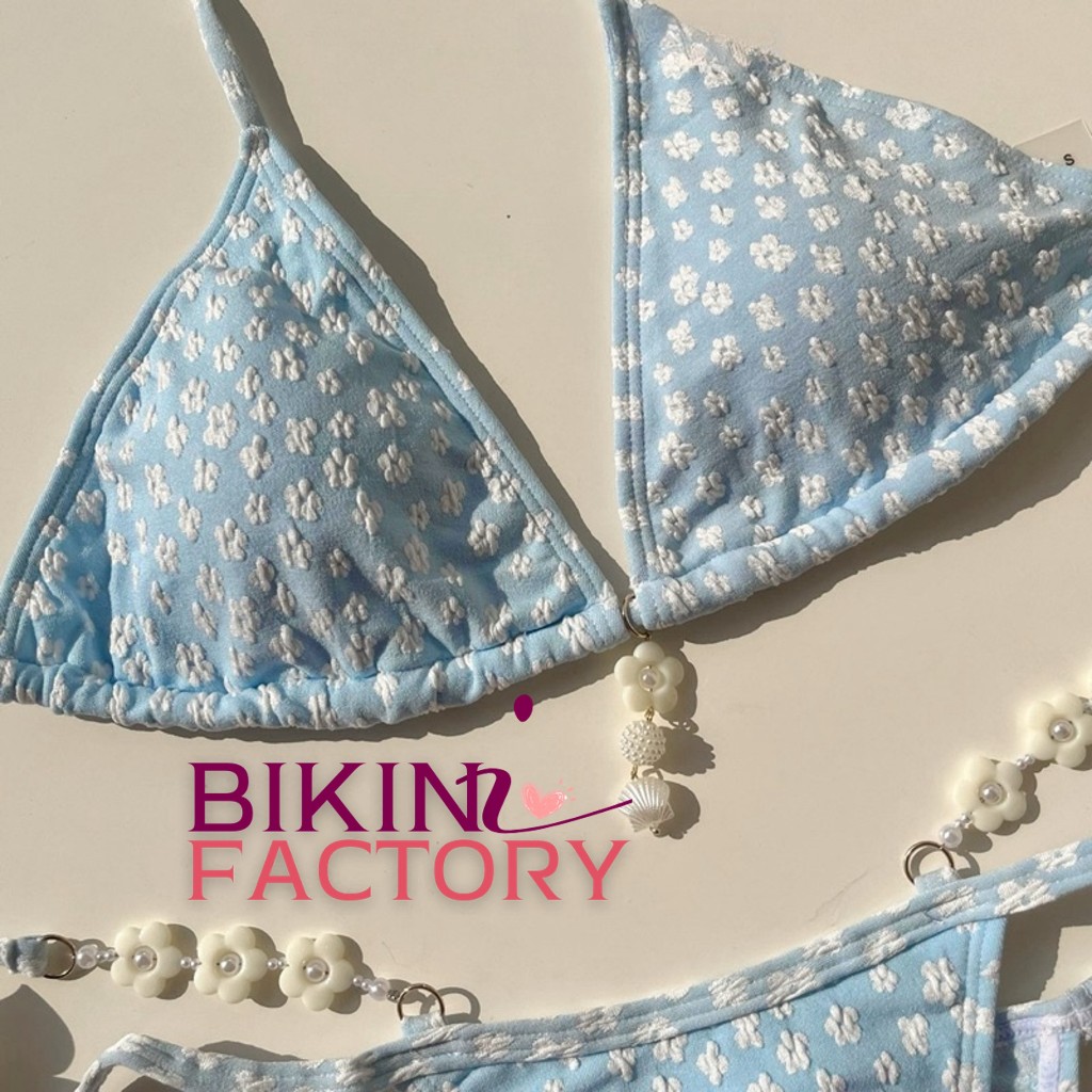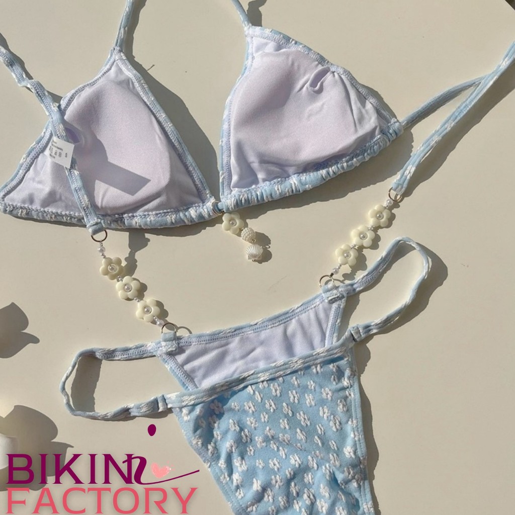 BIKINI FACTORY บิกินี่ลายดอกไม้ขาว บิกินี่ทูพีช ชุดว่ายน้ำสไตล์น่ารัก ? บราสามเหลียม แต่งจี้มุกดอกไม้ ผูกคอผูกเอว BK-074