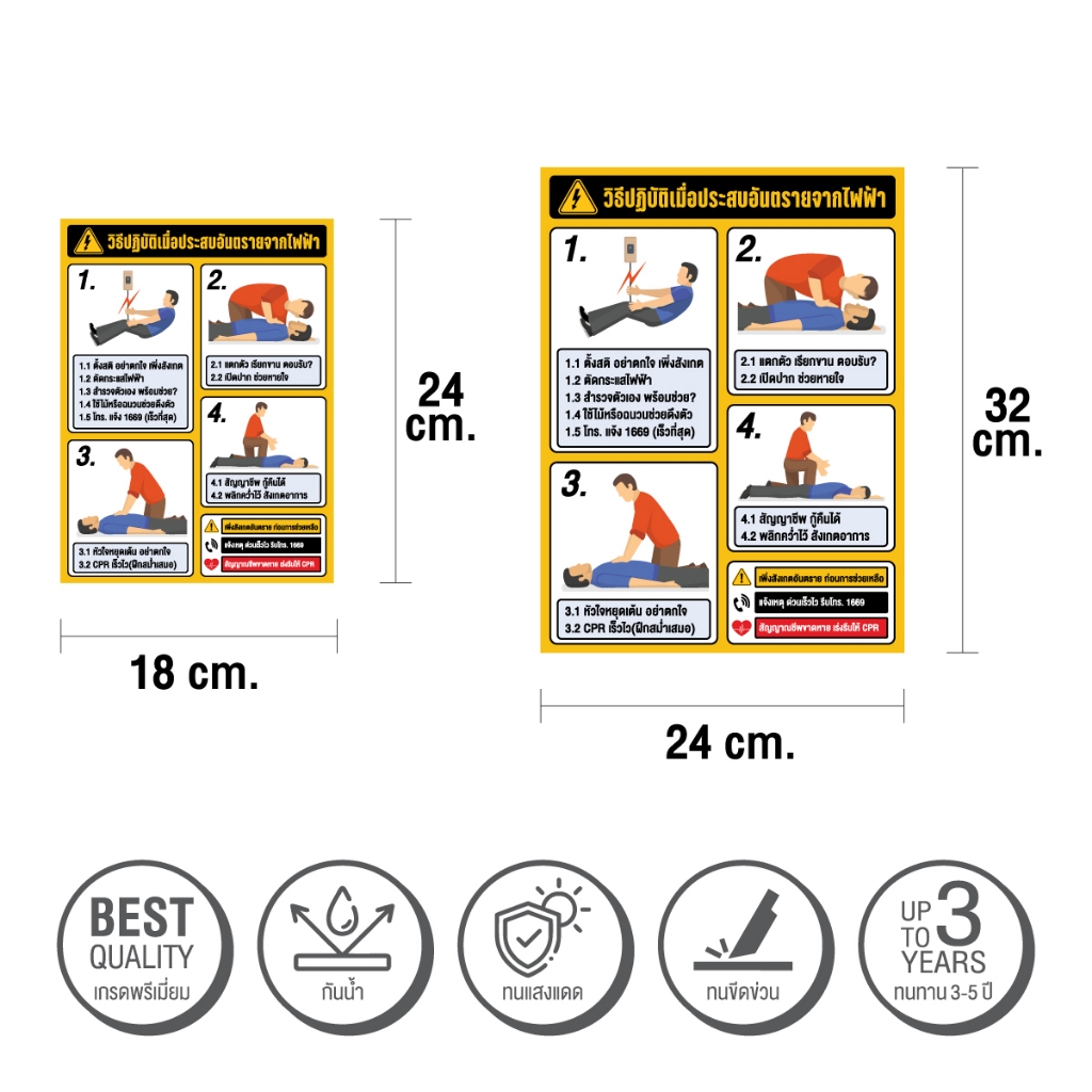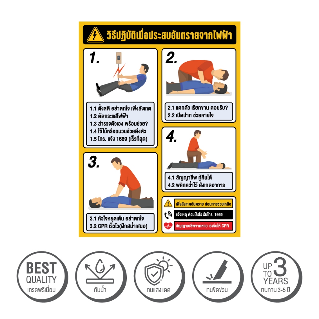 วิธีปฏิบัติเมื่อประสบอันตรายจากไฟฟ้า ขั้นตอน CPR ป้ายเตือน ความปลอดภัย Safety ป้ายสติกเกอร์ PVC 3M