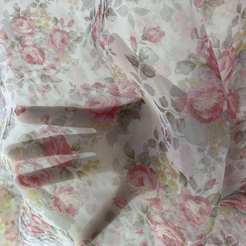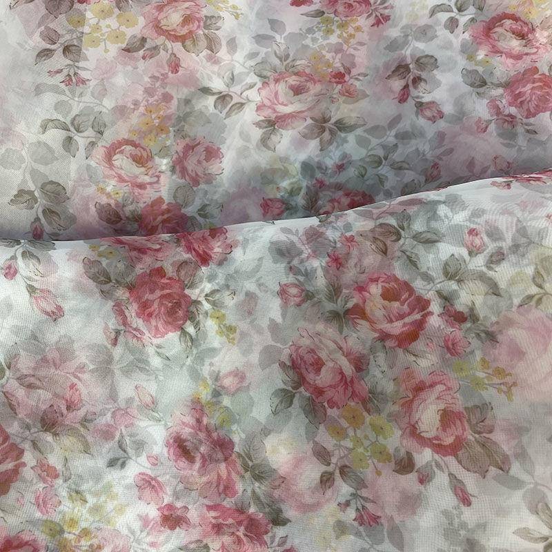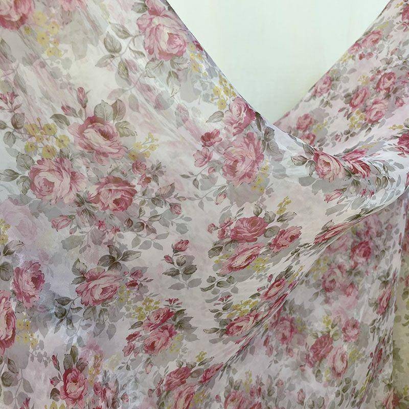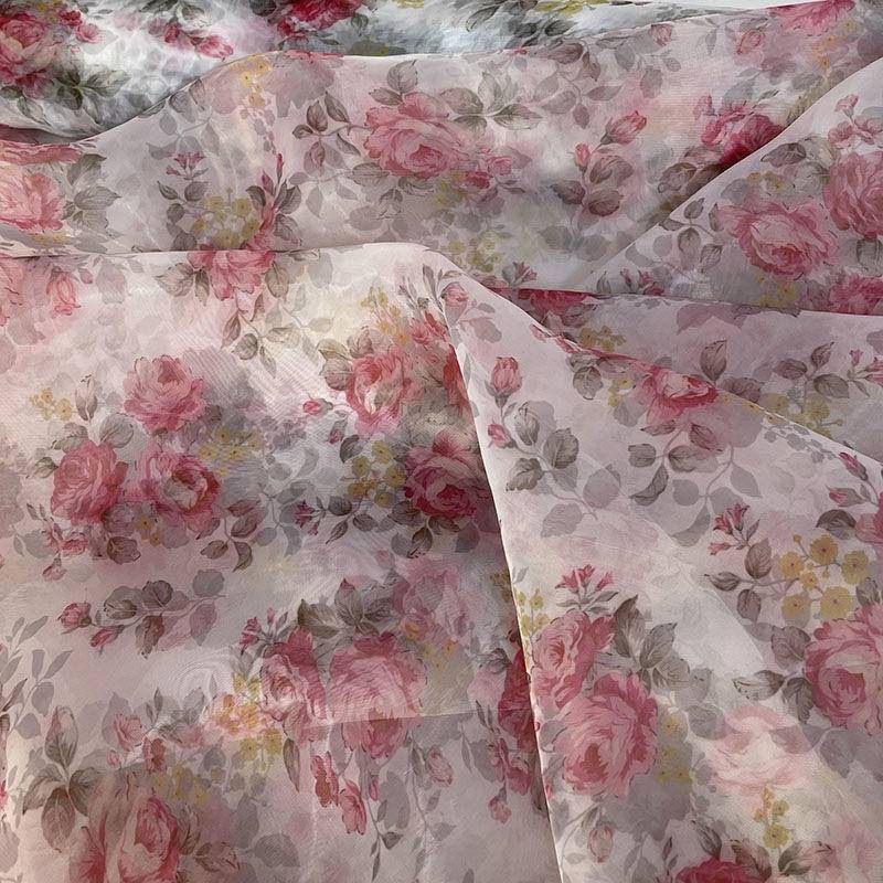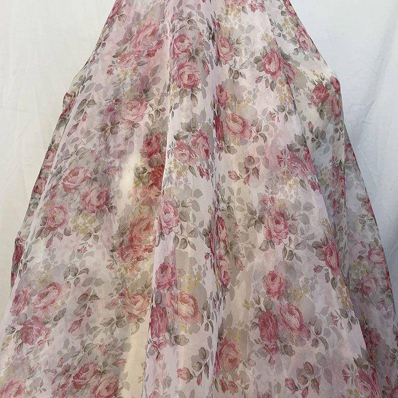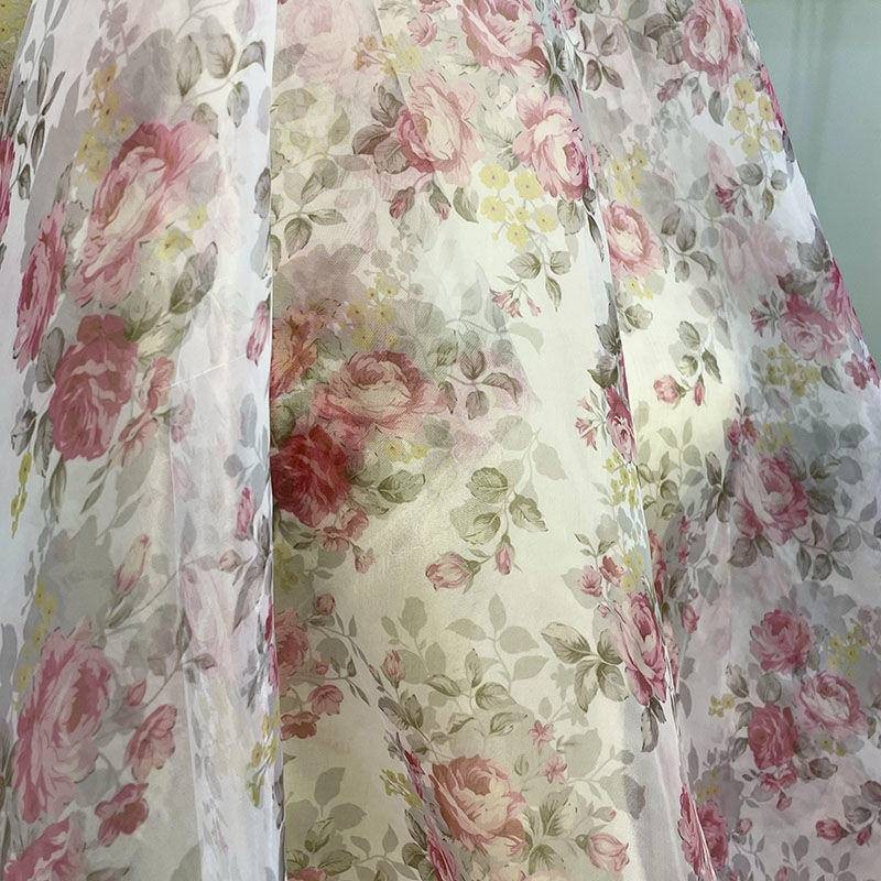 145*100ซม วินเทจกุหลาบพิมพ์ออร์แกนซ่าต่อต้านริ้วรอยโปร่งแสง ผ้าเดรสสไตล์ภาพวาดสีน้ํามัน