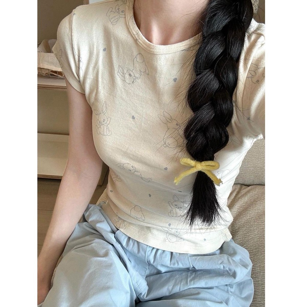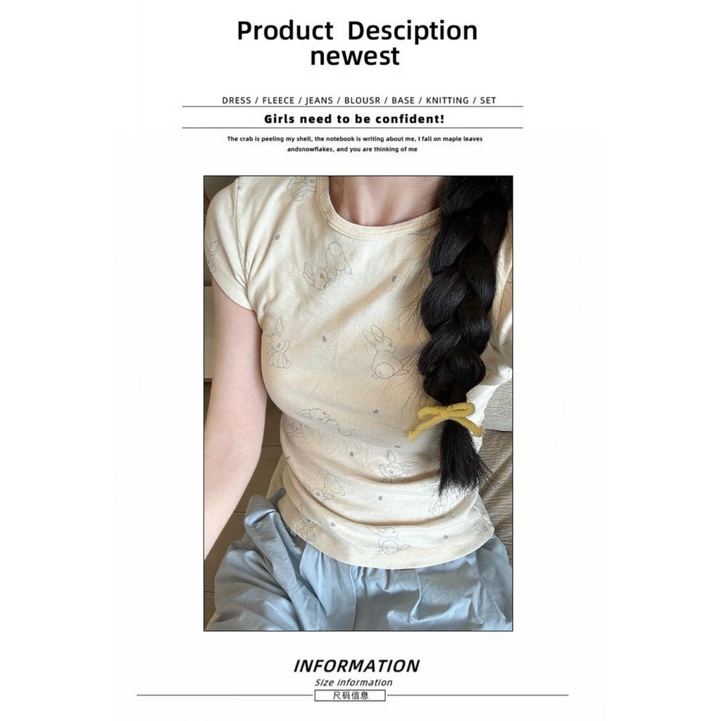 ผ้าฝ้ายแท้กระต่ายด้านหน้าไหล่แขนสั้นเสื้อยืดผู้หญิงฤดูร้อนความปรารถนาบริสุทธิ์หวานสลิมฟิตสั้นสาวร้อน