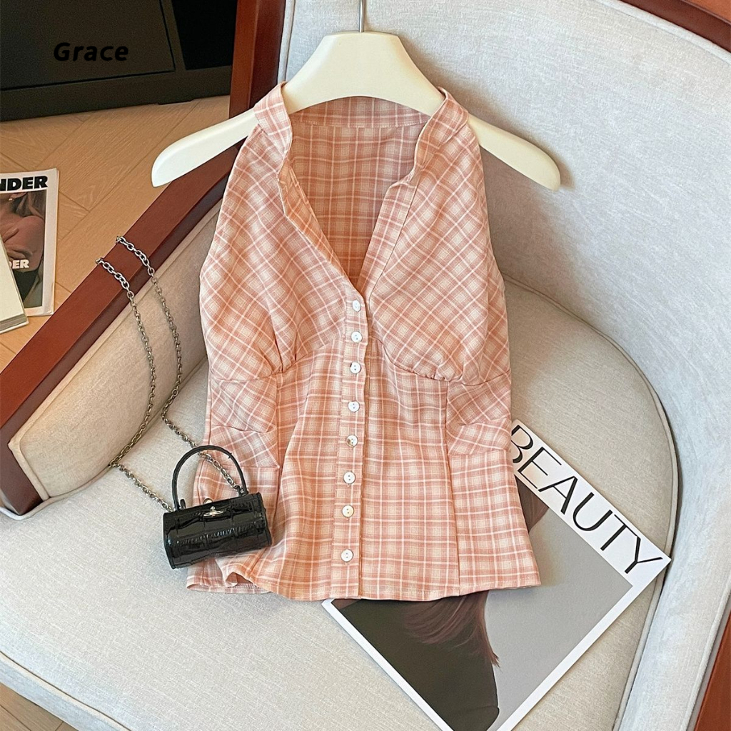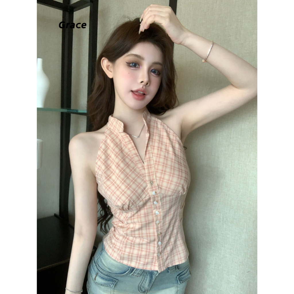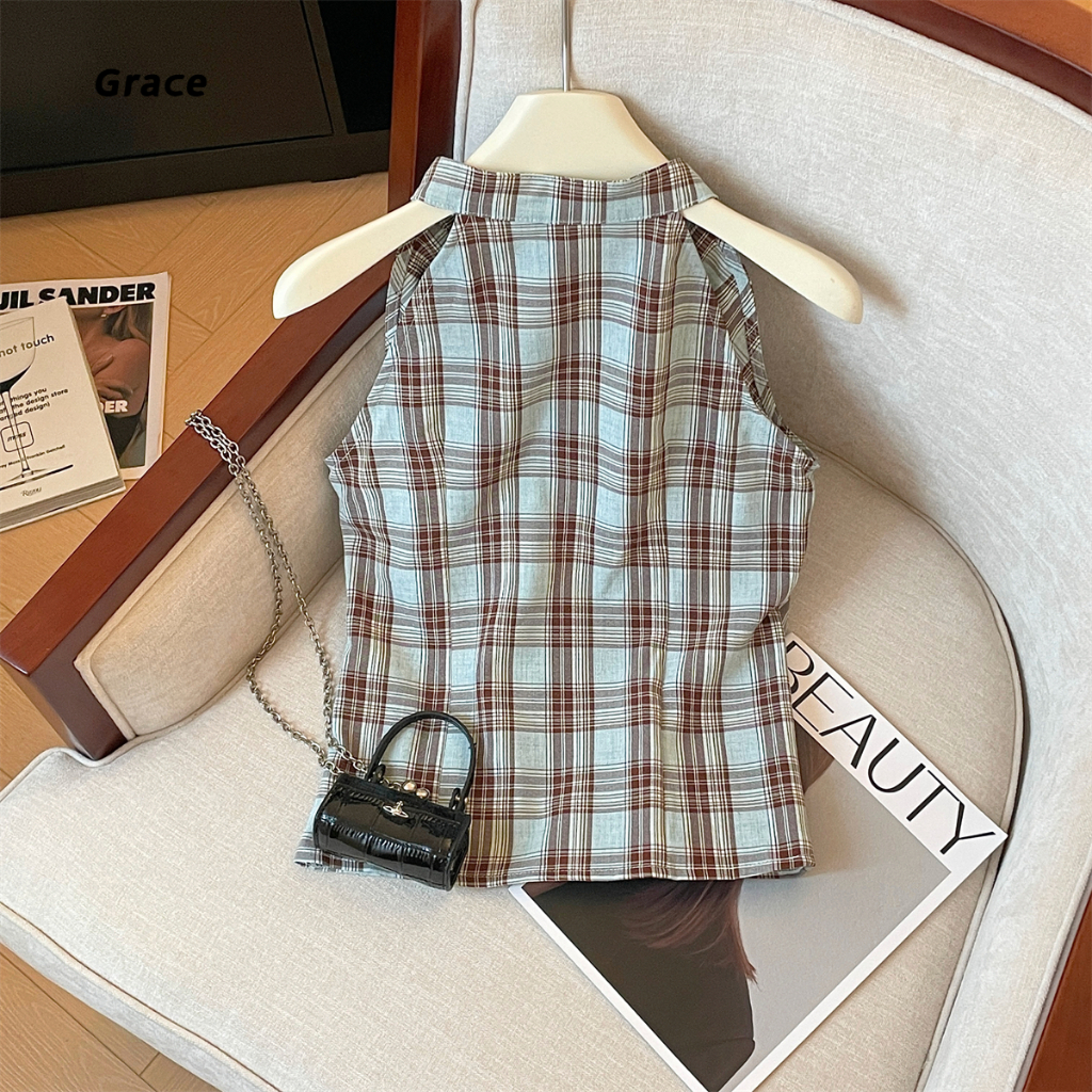 [Grojoy] Pure Desire Check Lapel Halterneck เสื้อแฟชั่นเสื้อแขนกุดสั้น G99931 #