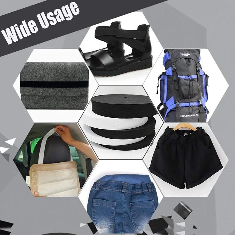 1.ยางพาราธรรมชาติและโพลีเอสเตอร์ ยางพาราธรรมชาติ 2.สี:ขาวและดำ 3.ความกว้างของขนาด: 10 มม., 15 มม., 20 มม., 25 มม., 30 มม., 3