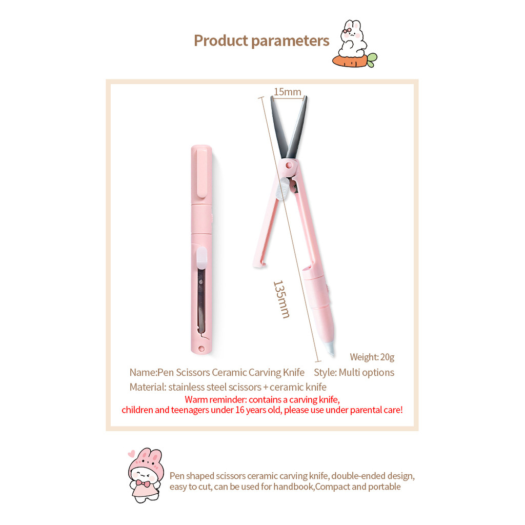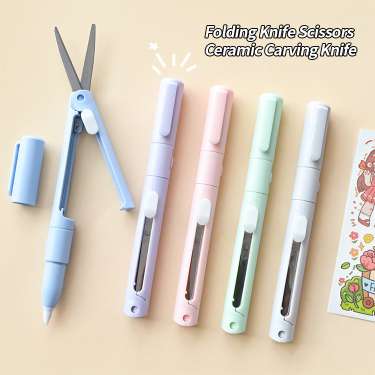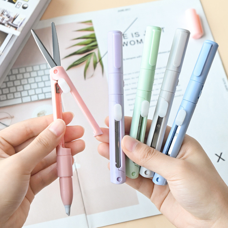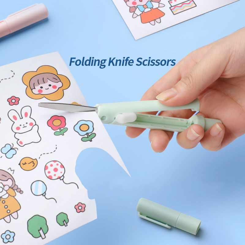 กรรไกรพับได้ขนาดเล็กพร้อมมีดปากกา 2 in 1 เครื่องตัดกระดาษมีดยูทิลิตี้ DIY Art Crafts เครื่องมือตัดคาวาอี้สำนักงานเครื่องเขียน
