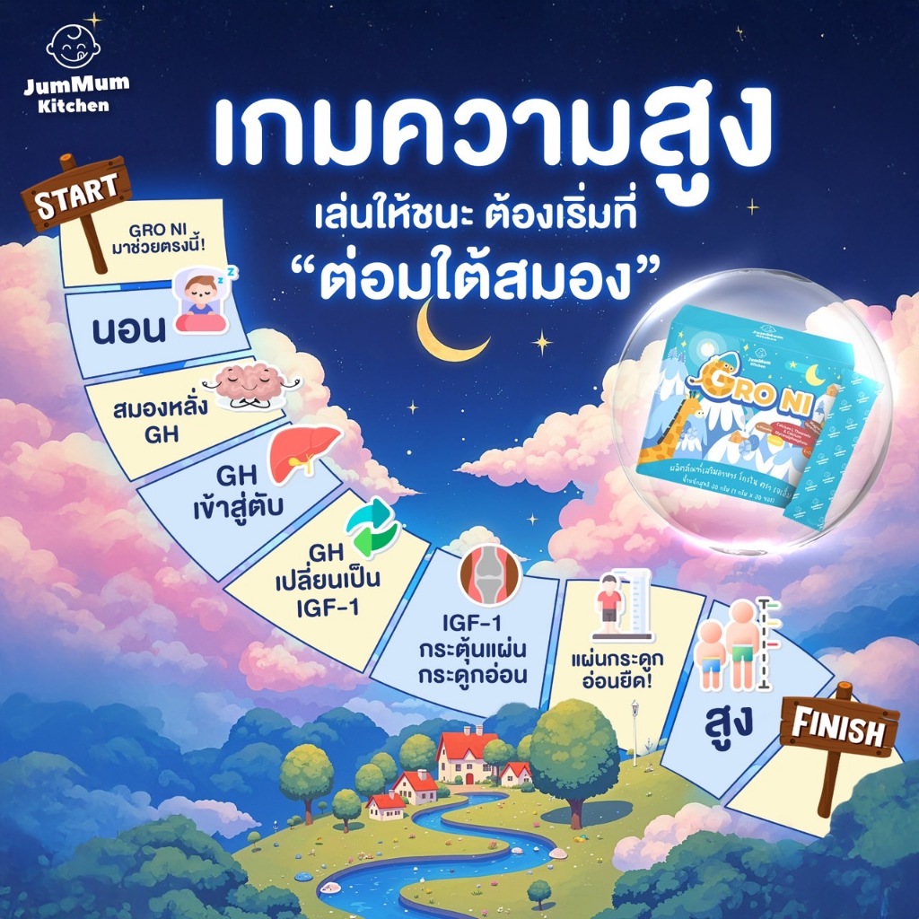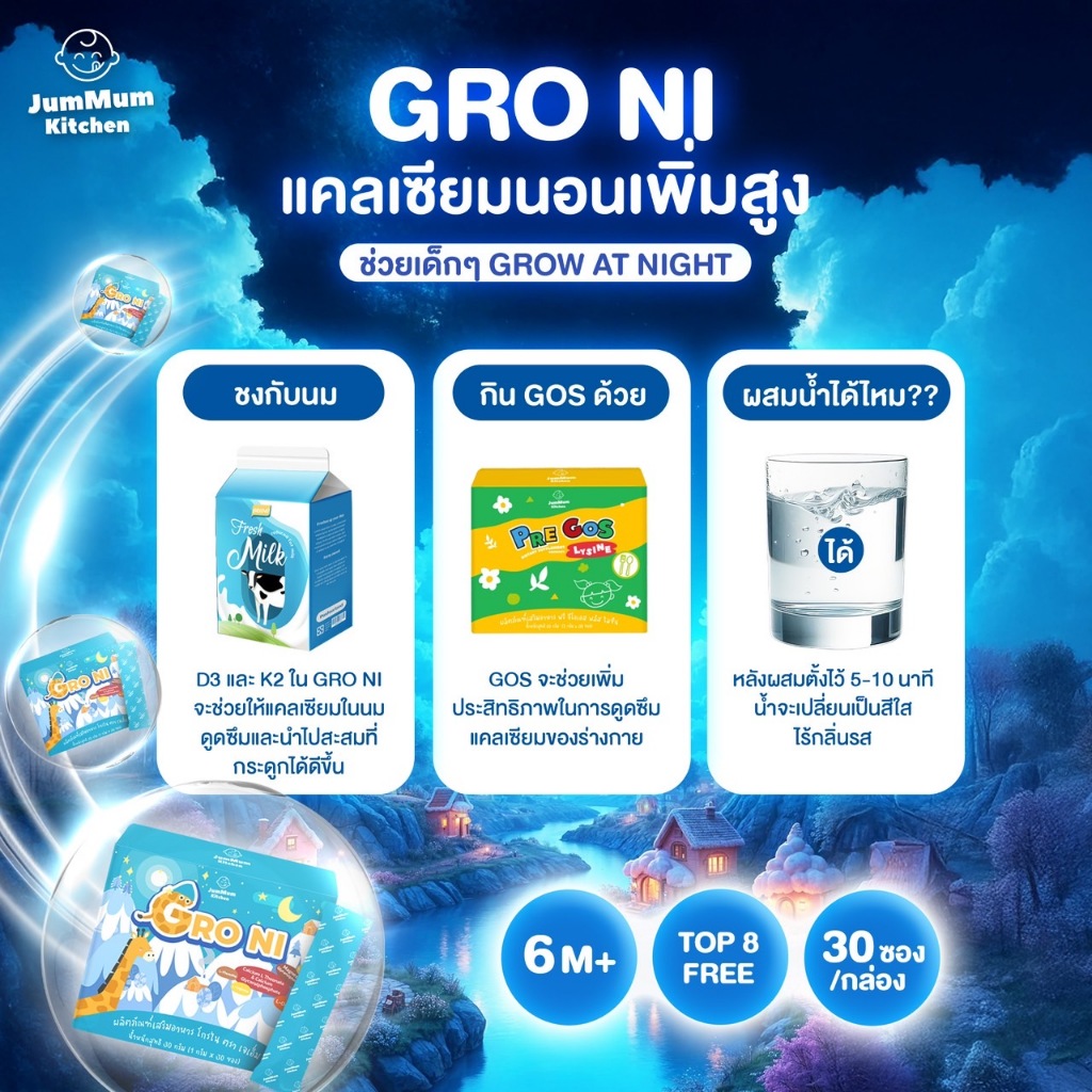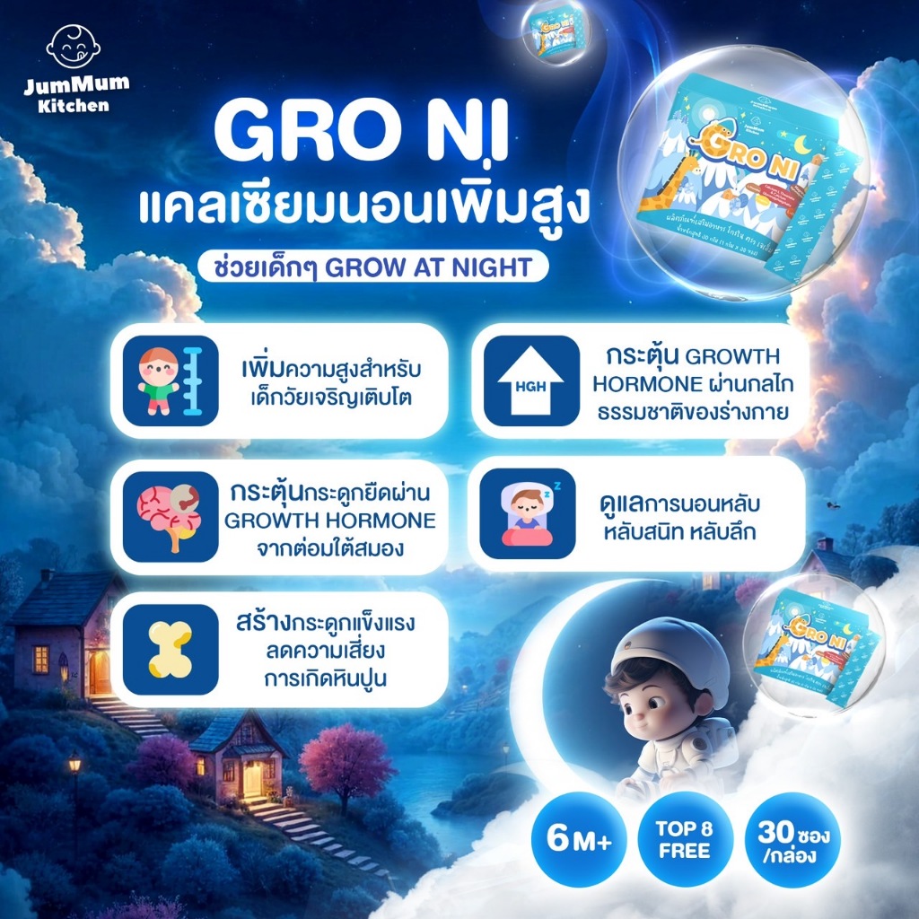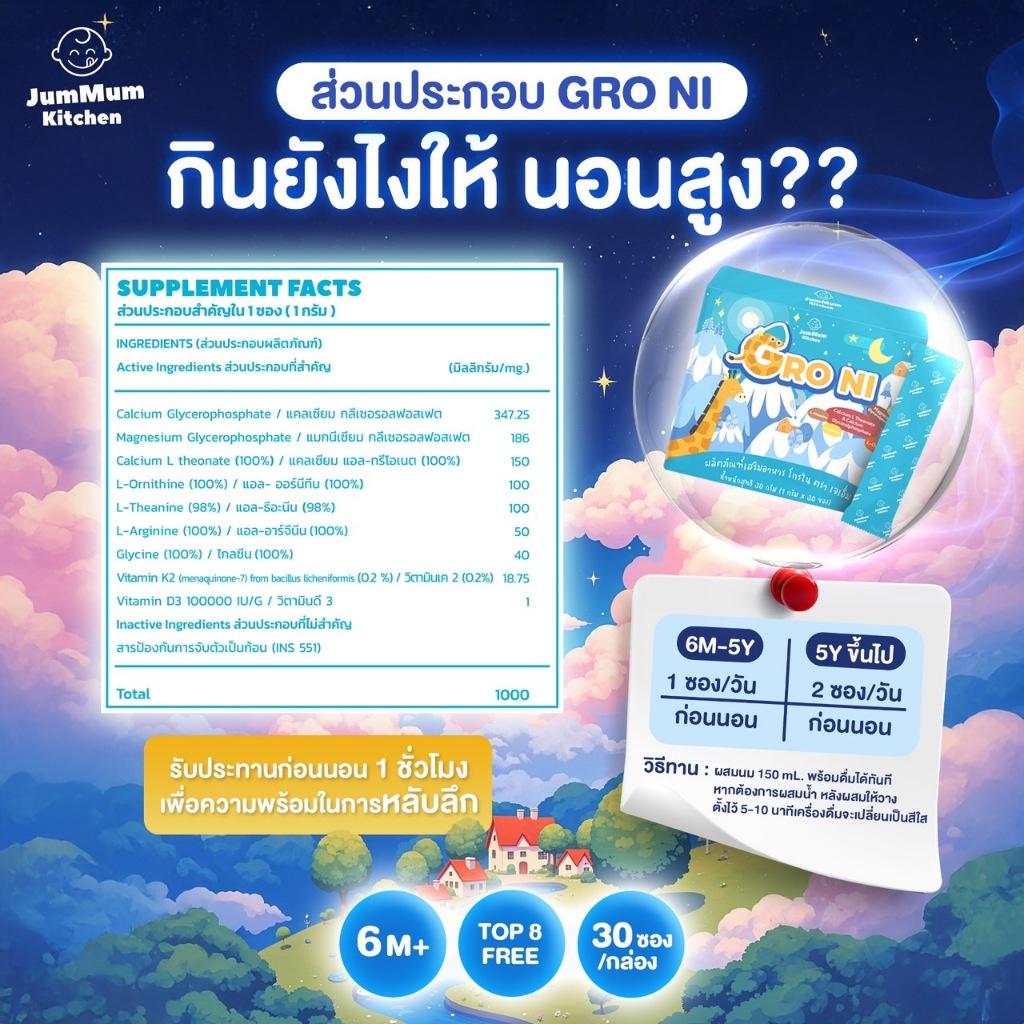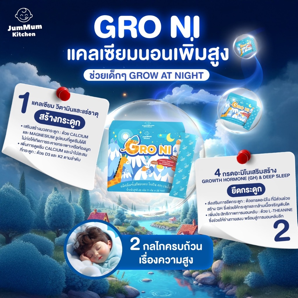 แคลเซียม Gro Ni โกรไน เสริมการเจริญเติบโตและการนอน ผลิตภัณฑ์เสริมอาหาร JM Brand Jummum Kitchen