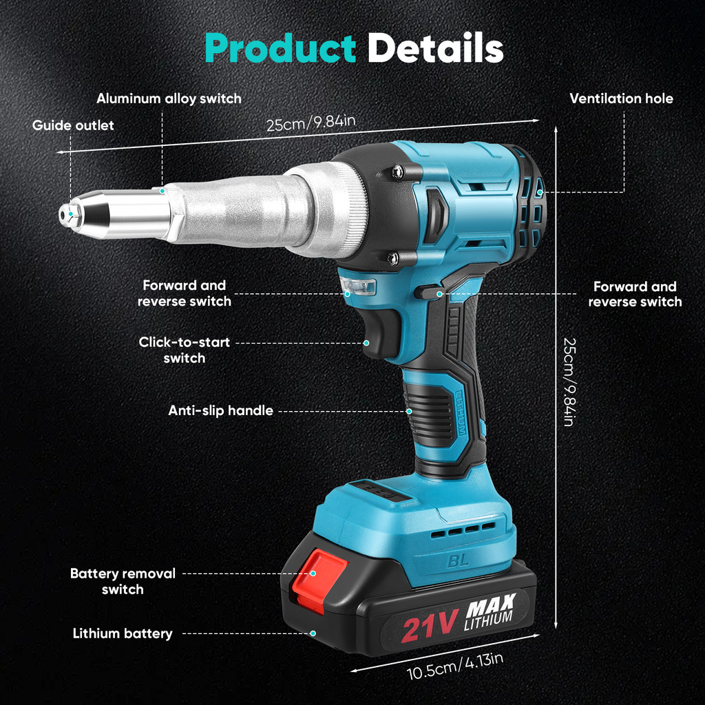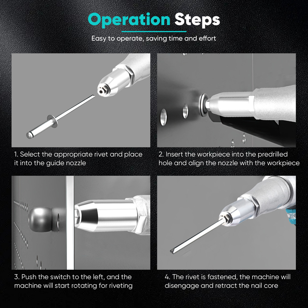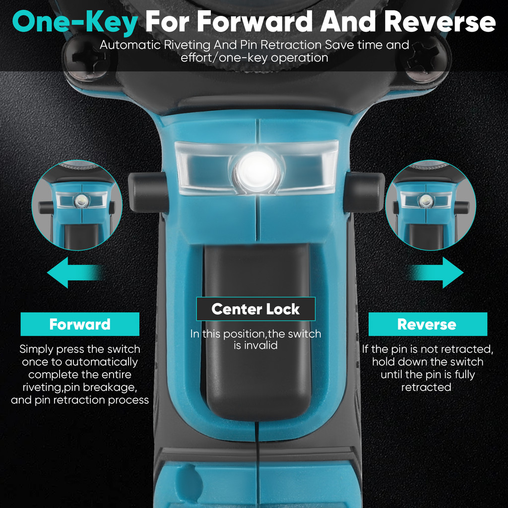 มอเตอร์ไร้แปรงถ่านเสียงรบกวนต่ำ: น็อต Rivet มีมอเตอร์ไร้แปรงถ่านเสียงรบกวนต่ำเพื่อลดเสียงรบกวนและการกระจายความร้อนที่ดีขึ้นช่วยยืดอายุการใช้งาน ไม่ต้องใช้สายเคเบิลและเชื่อมต่อแบตเตอรี่เพื่อความสะดวกในการใช้งานทุกที่