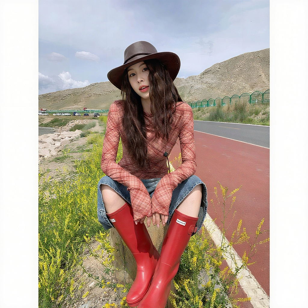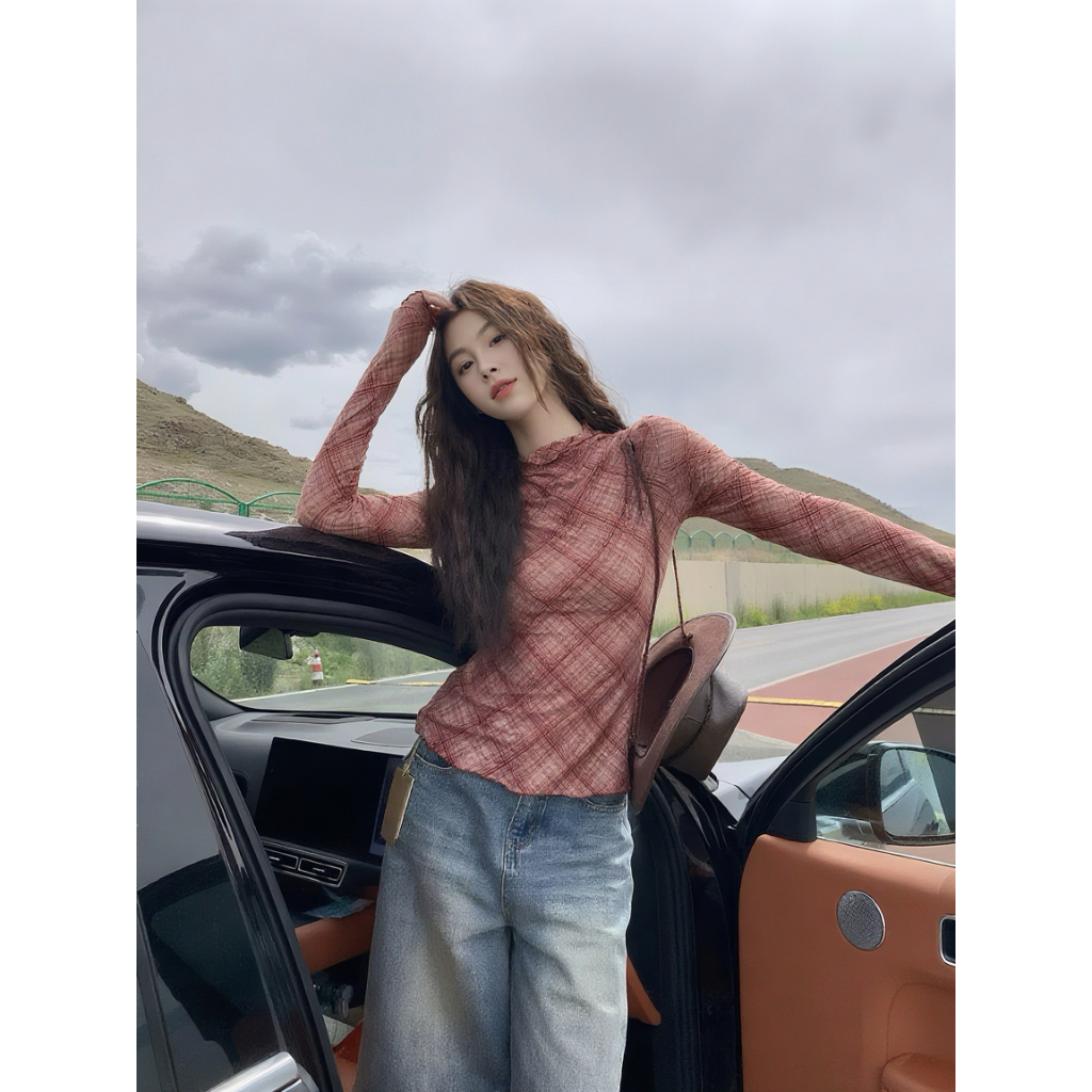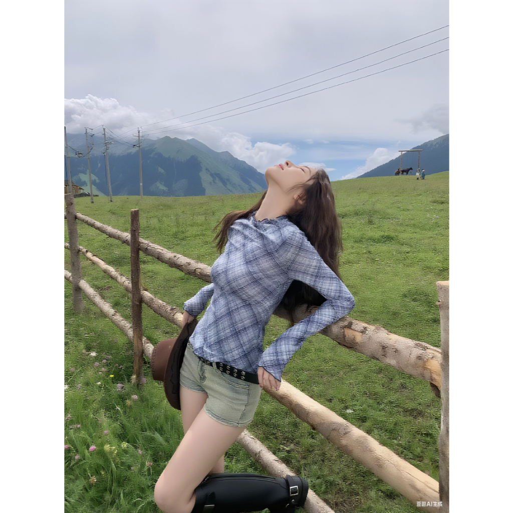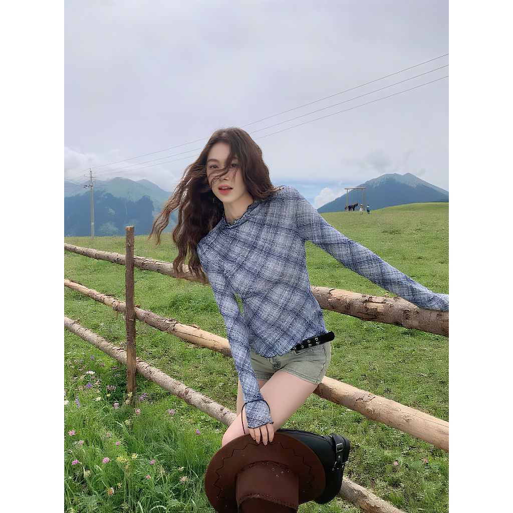 Lln?พร้อมส่ง? เสื้อยืดคอกลมแขนสั้นลายสก็อตสไตล์ฮ่องกงย้อนยุคสำหรับผู้หญิงในช่วงฤดูร้อนเอวเข้ารูปสาวฮอตตัวเล็กเสื้อยืดผู้หญิง