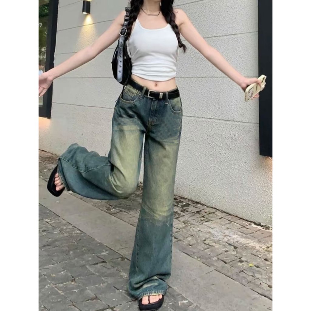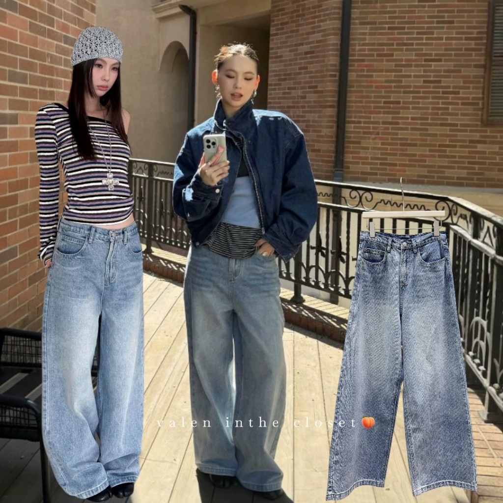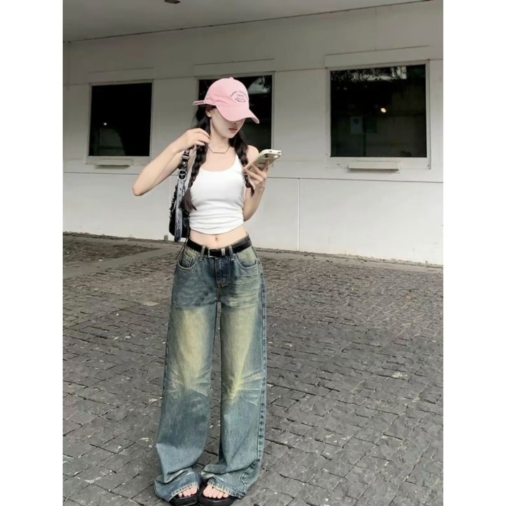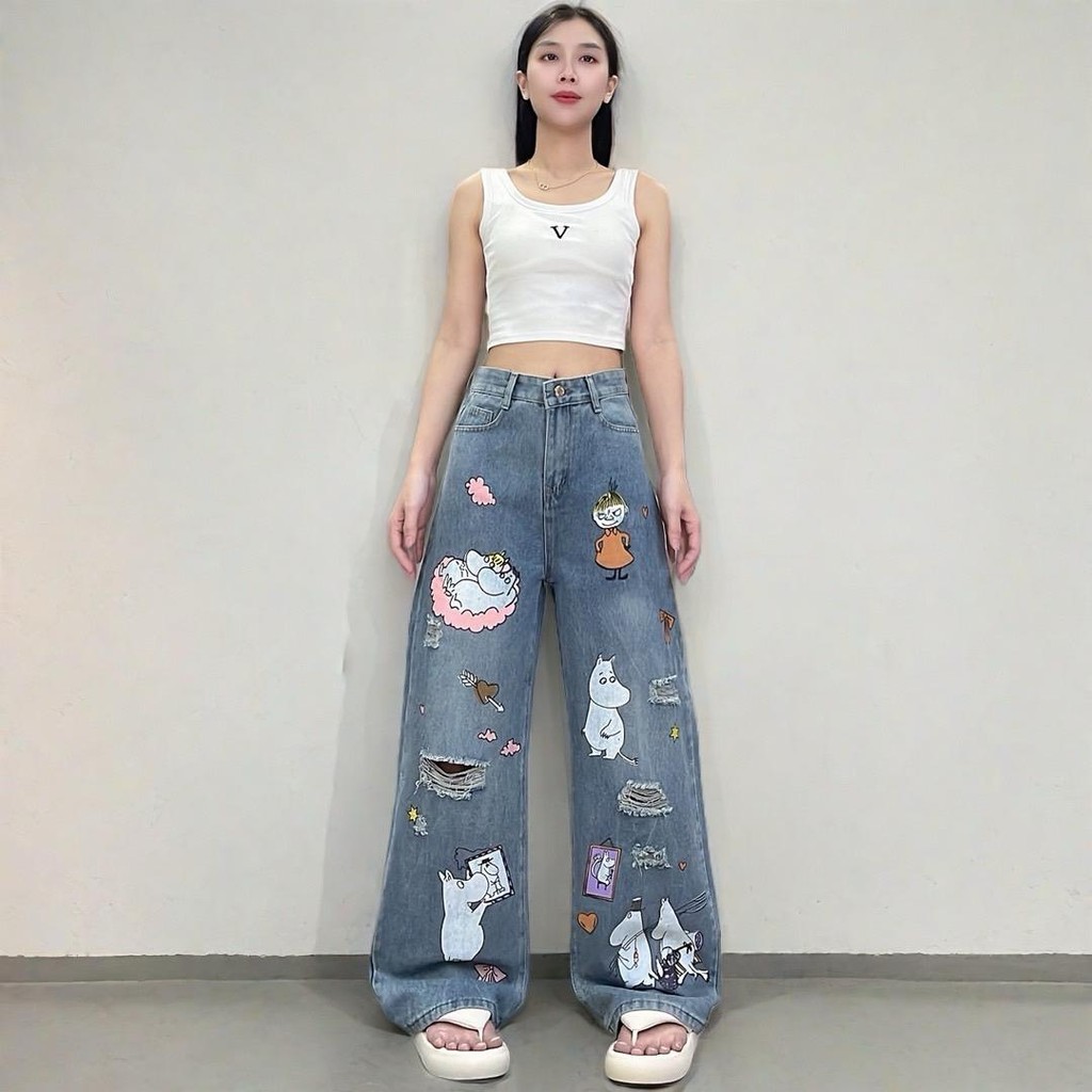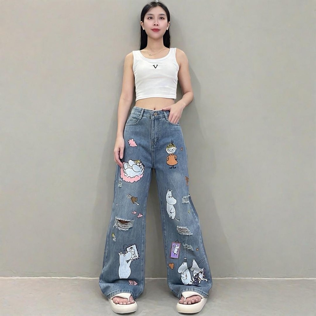 NAMCHA กางเกงยีนส์กระบอกกลางเอวสูง สียีนส์ สกรีนลาย แต่งขาด 2662