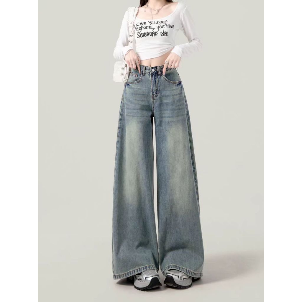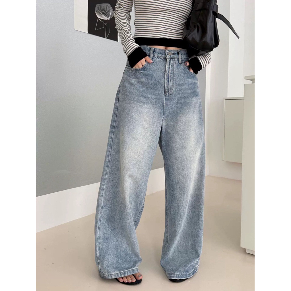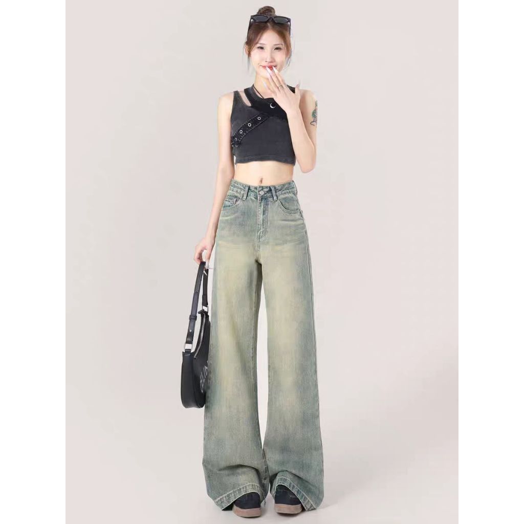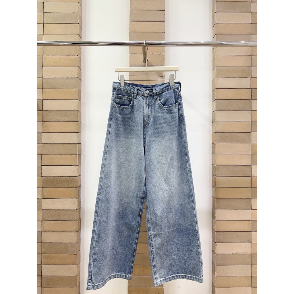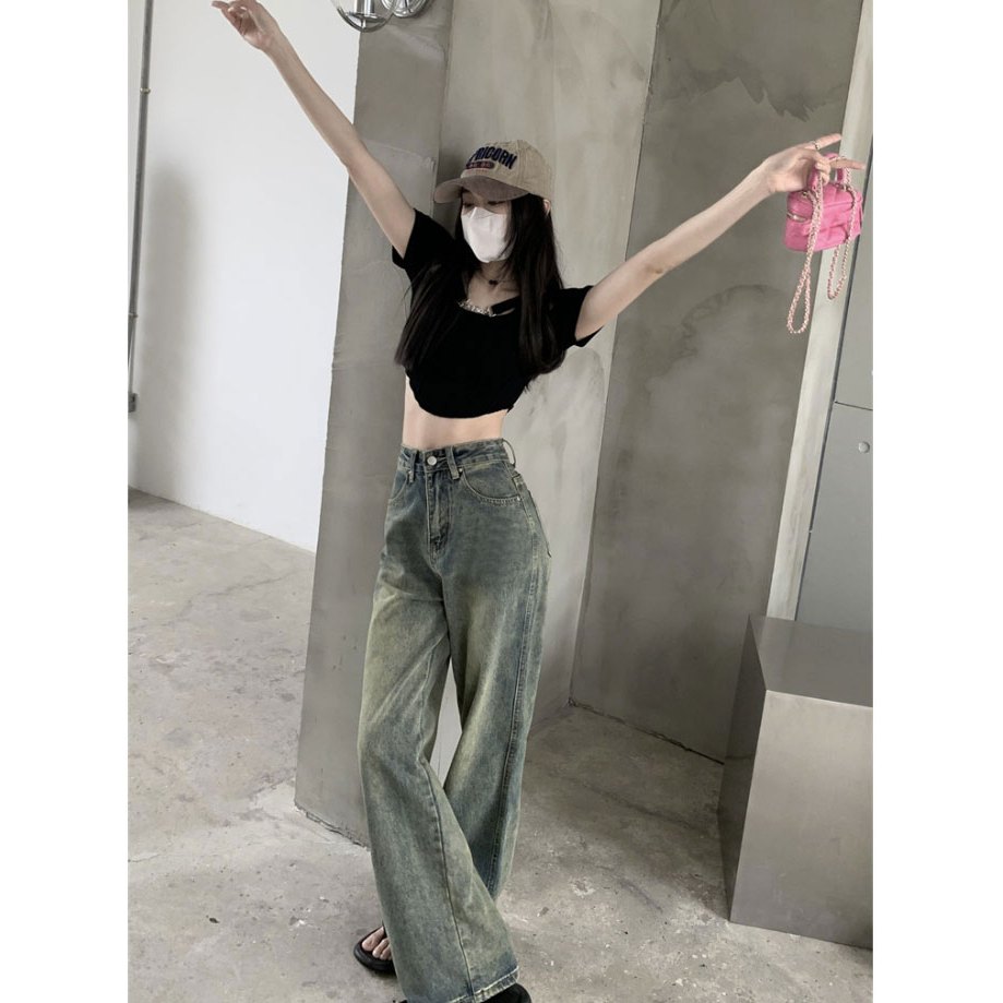 NAMCHA กางเกงยีนส์กระบอกกลางเอวสูง สียีนส์ สกรีนลาย แต่งขาด 2662