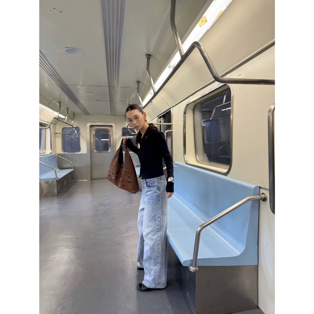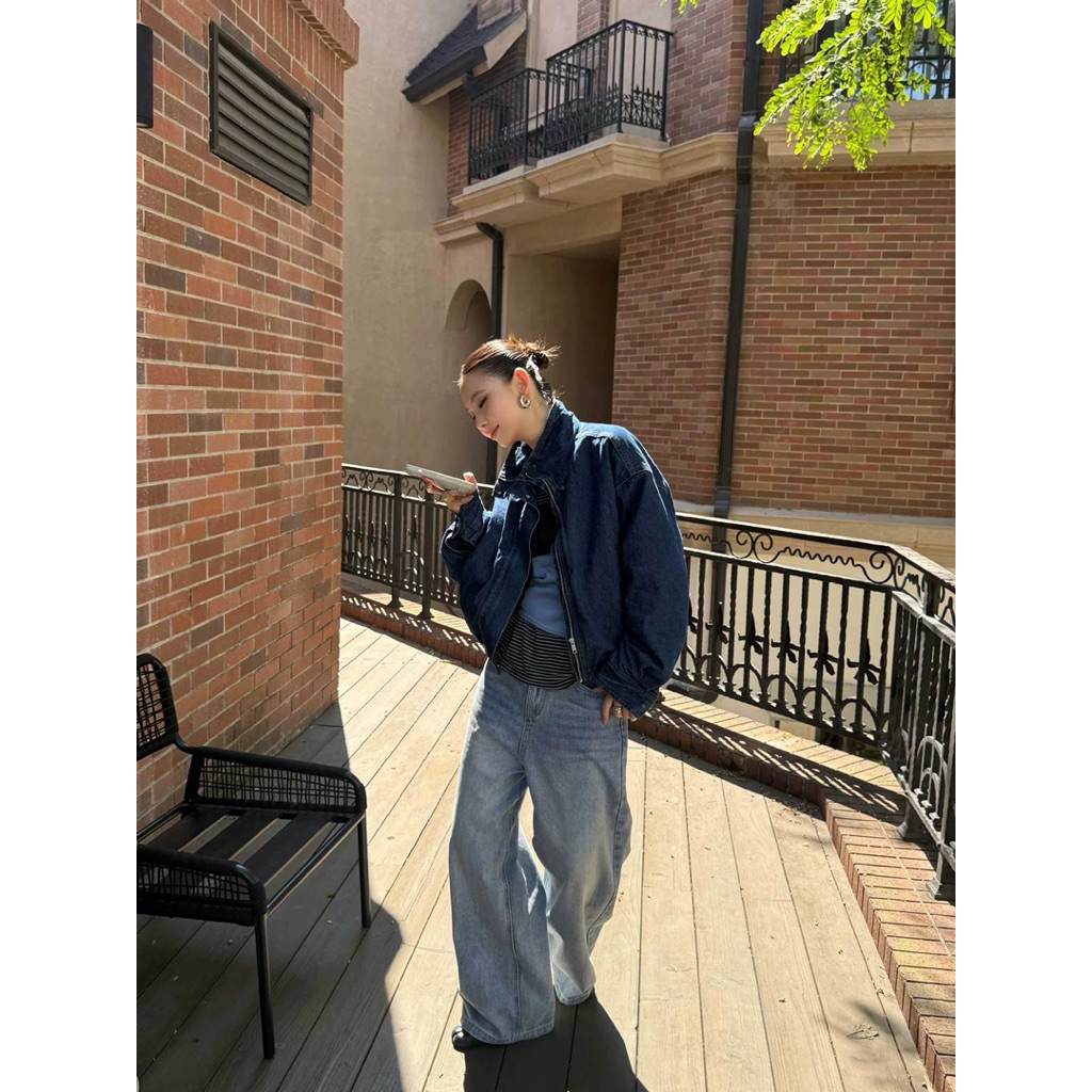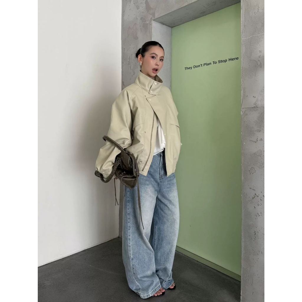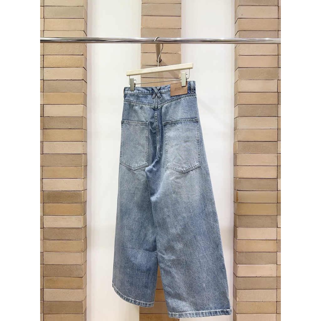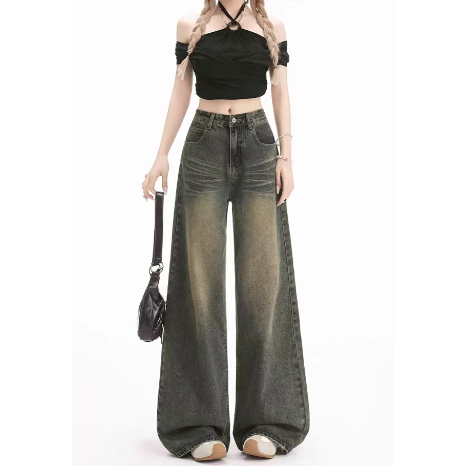 NAMCHA กางเกงยีนส์กระบอกกลางเอวสูง สียีนส์ สกรีนลาย แต่งขาด 2662