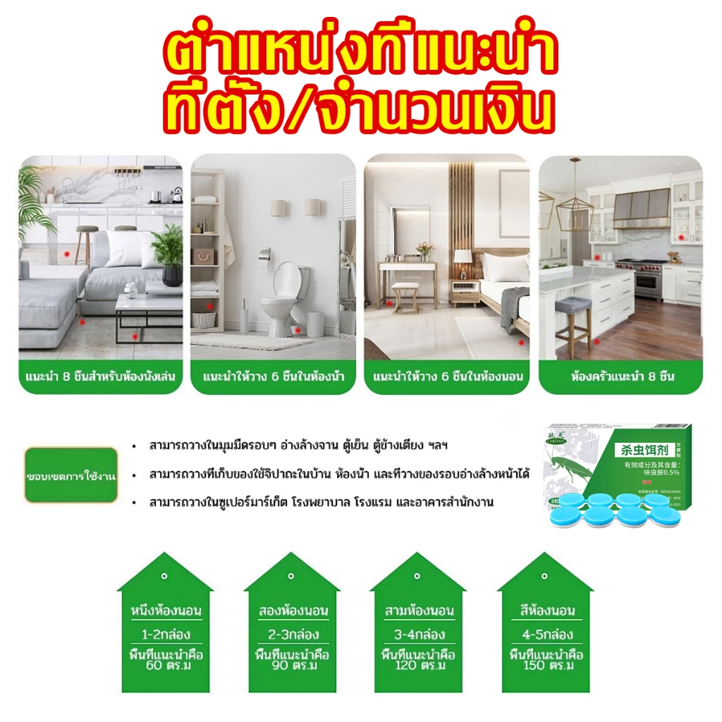 ? ขอบเขตการใช้งาน:วางยาบนรอยแยกในครัว ภายในตู้ มุมผนัง ถังขยะ และที่อื่นๆ ที่มีแมลงสาบปรากฏบ่อย