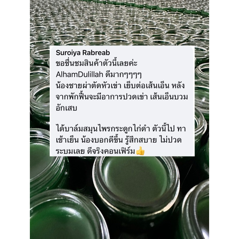 บาล์มสมุนไพรกระดูกไก่ดำเข้มข้น บรรเทาอาการปวดเมื่อย บรรเทาอาการอักเสบข้อต่อและกล้ามเนื้อ แก้อาการฟกช้ำออฟฟิศซินโดรม ถอนพิษจากแมลงสัตว์กัดต่อย ช่วยลดอาการผดผื่นคัน แผลไหม้พุพอง เนื้อสัมผัสเย็น ไม่ร้อนแสบมือหรือบริเวณที่ทา