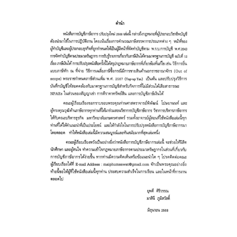 หนังสือการบัญชีภาษีอากร ปรับปรุงใหม่ 2568 เล่มนี้ กล่าวถึงกฎหมายที่ผู้ประกอบวิชาชีพบัญชีต้องนำมาใช้ในการปฏิบัติงาน โดยเน้นเรื่องการคำนวณภาษีสรรพากรประเภทต่างๆ หน้าที่ของผู้ทำบัญชีและผู้ประกอบธุรกิจที่ถูกกำหนดให้เป็นผู้มีหน้าที่จัดทำบัญชีตาม พ.ร.บ.การบัญชี