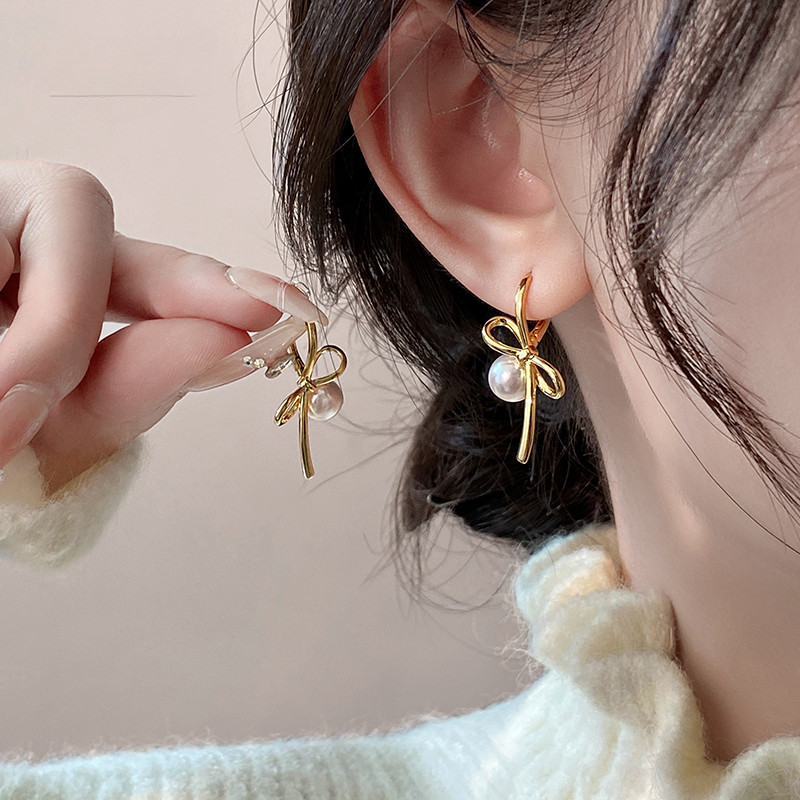 ผู ้ หญิง Dangle Pearl Bowknot ต ่ างหูสตั ๊ ดต ่ างหูอุปกรณ ์ เสริม