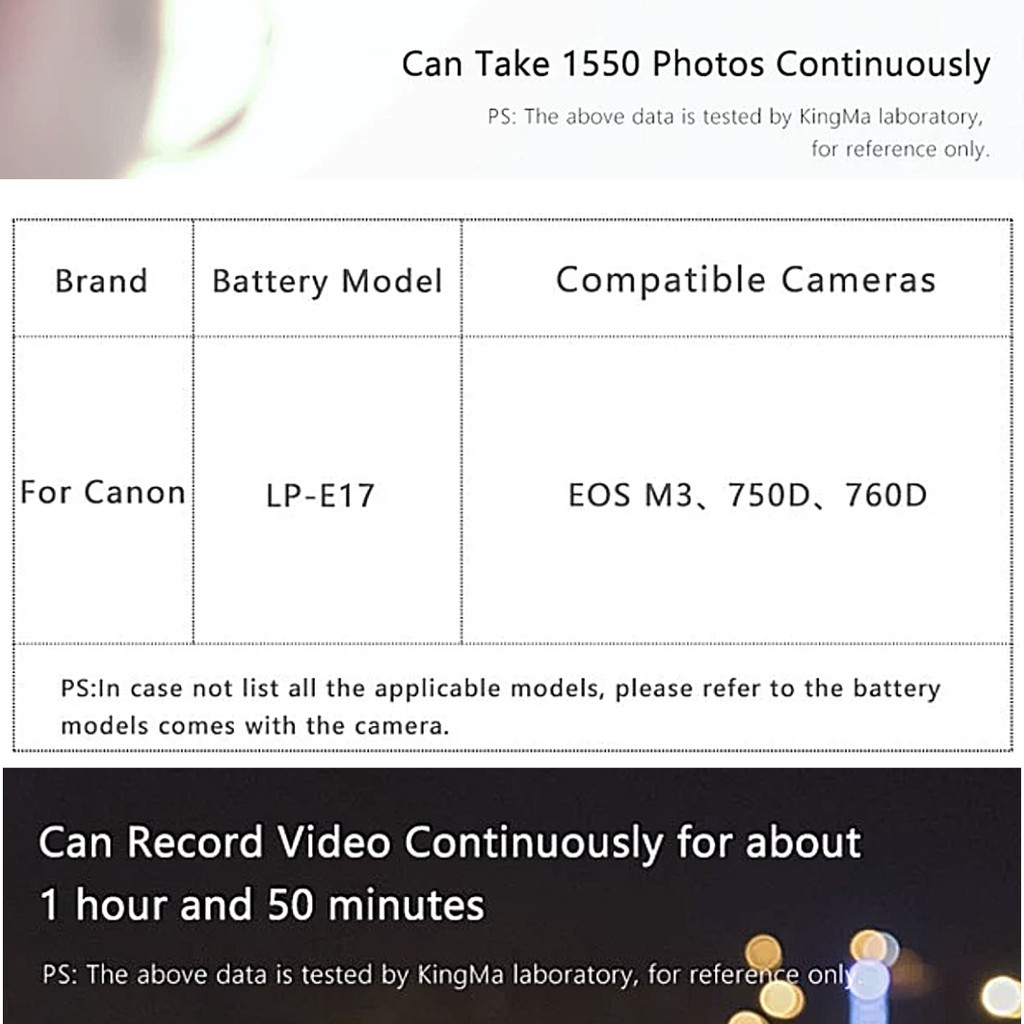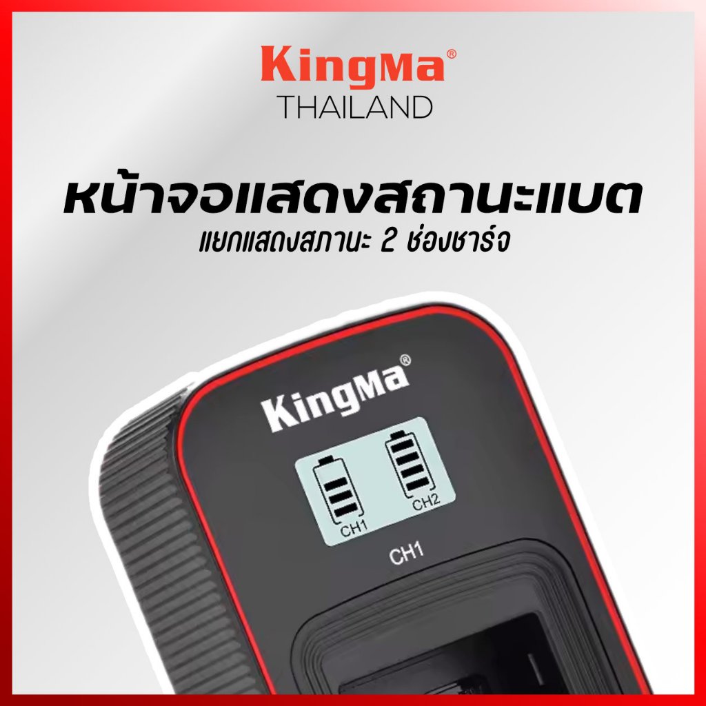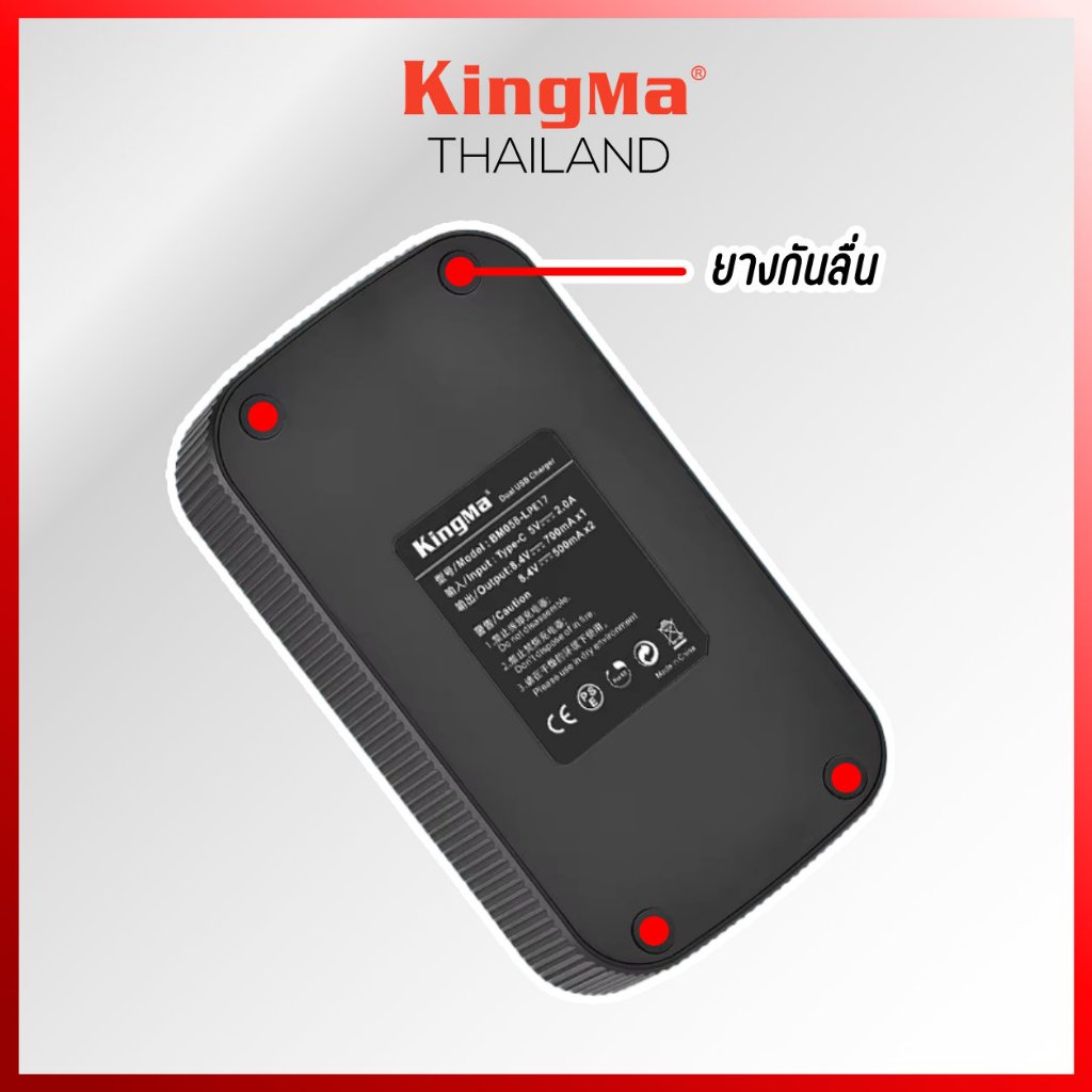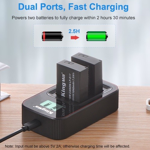 แบตเตอรี่รุ่นนี้ไม่สามารถใช้งานร่วมกับแท่นชาร์จเดิมของ Canon ได้ แนะนำให้ใช้แท่นชาร์จของ Kingma ที่ออกแบบมาให้รองรับแบตเตอรี่ทั้งแท้และ Kingma ได้อย่างสมบูรณ์แบบ