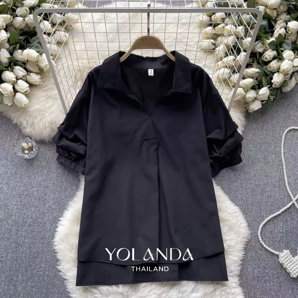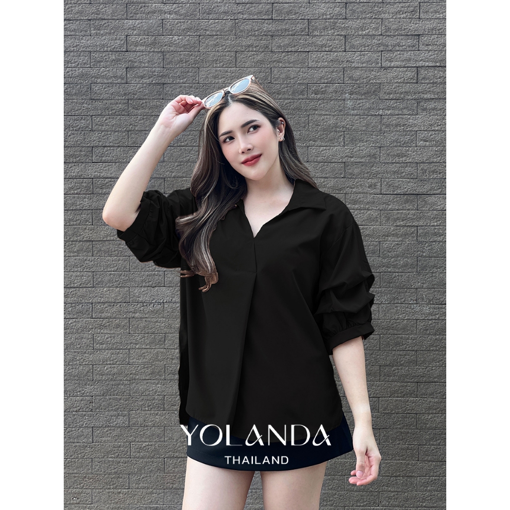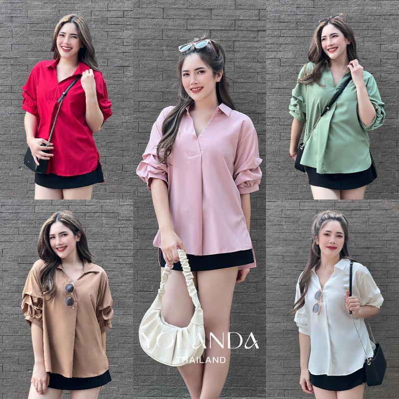 Yolanda เสื้อเชิ้ตแฟชั่น ผู้หญิง เสื้อคอวีแบบมีปก แขนแต่งจีบย้น
