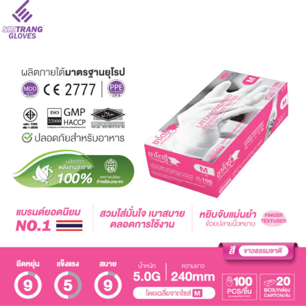 ศรีตรังโกลฟส์ - ซาโตรี่ (กล่องชมพู) ถุงมือยาง ธรรมชาติ แบบมีแป้ง [1กล่อง/100ชิ้น]