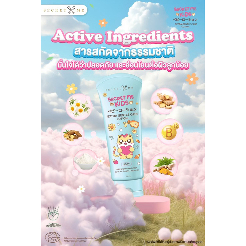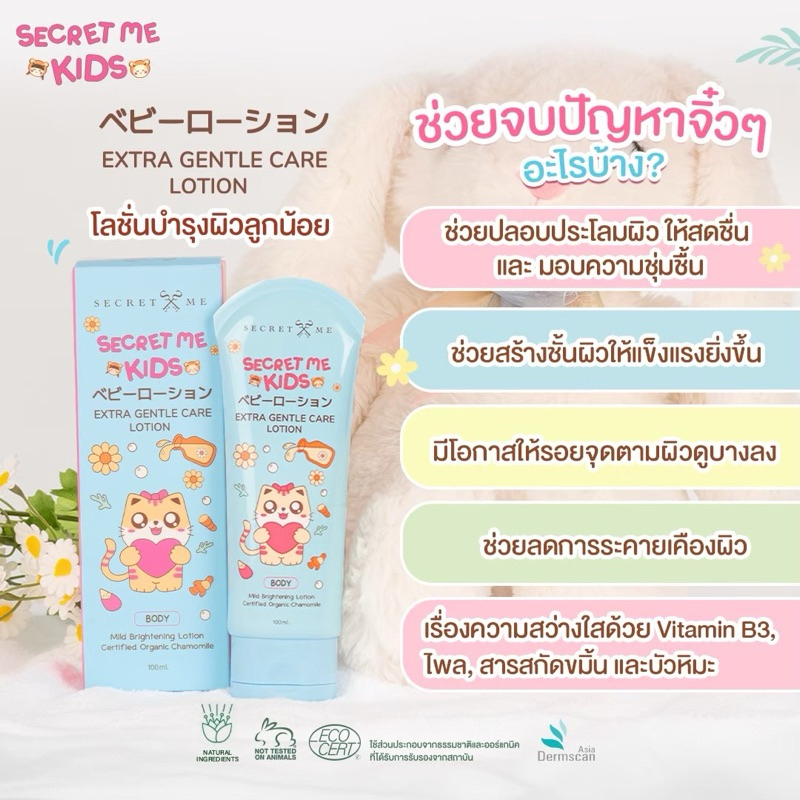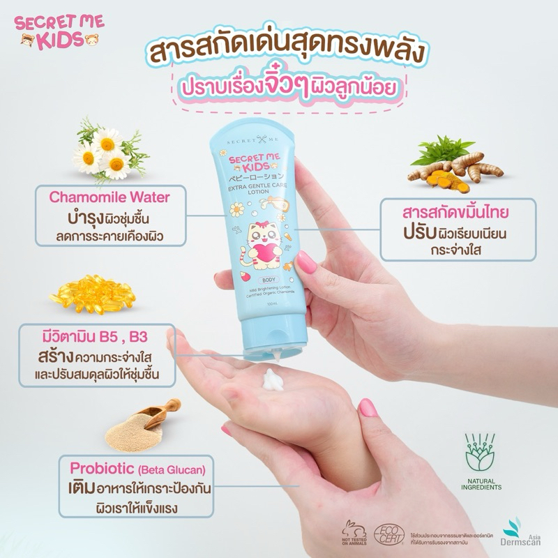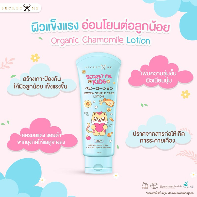 โลชั่นบำรุงผิวสูตรสารสกัดออร์แกนิคและส่วนผสมอื่นๆที่มาจากธรรมชาติ ซึ่งช่วยบำรุงผิวเด็กอย่างอ่อนโยน ปรับผิวสว่างใส ลดรอยจุดดำตามผิวให้ดูธรรมชาติทะนุถนอมผิวให้สุขภาพแข็งแรง ปราศจากสารที่ก่อให้เกิดการระคายเคือง